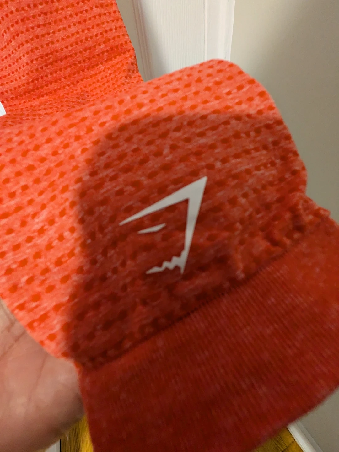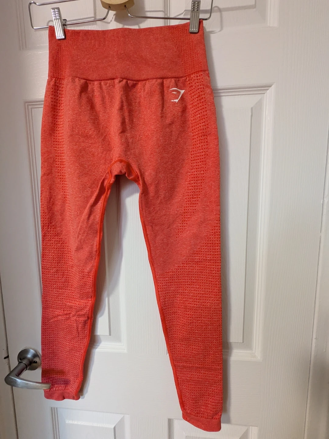 These Gymshark seamless leggings are in a vibrant coral colour. They feature a textured knit design for breathability and a flattering high waistband. They're perfect for your next workout session or for casual wear!