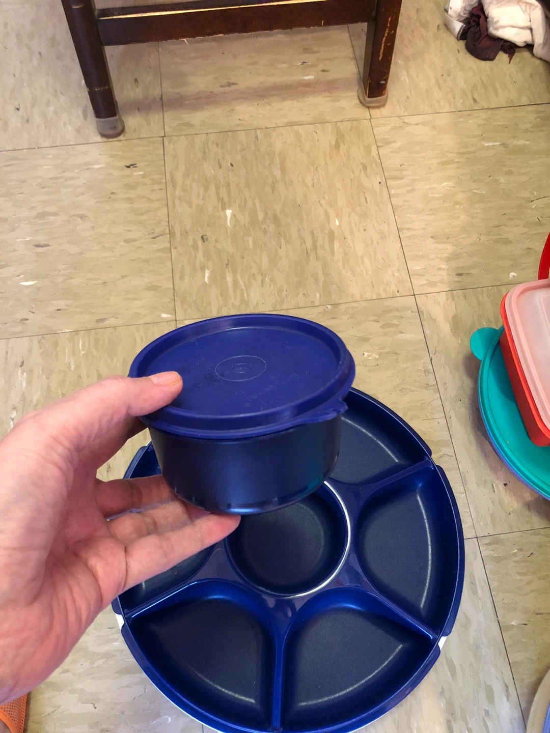 This is a vintage Tupperware divided serving platter. It's blue and white and comes with a white lid and four small blue bowls that fit inside the center. Great for serving snacks or appetizers!