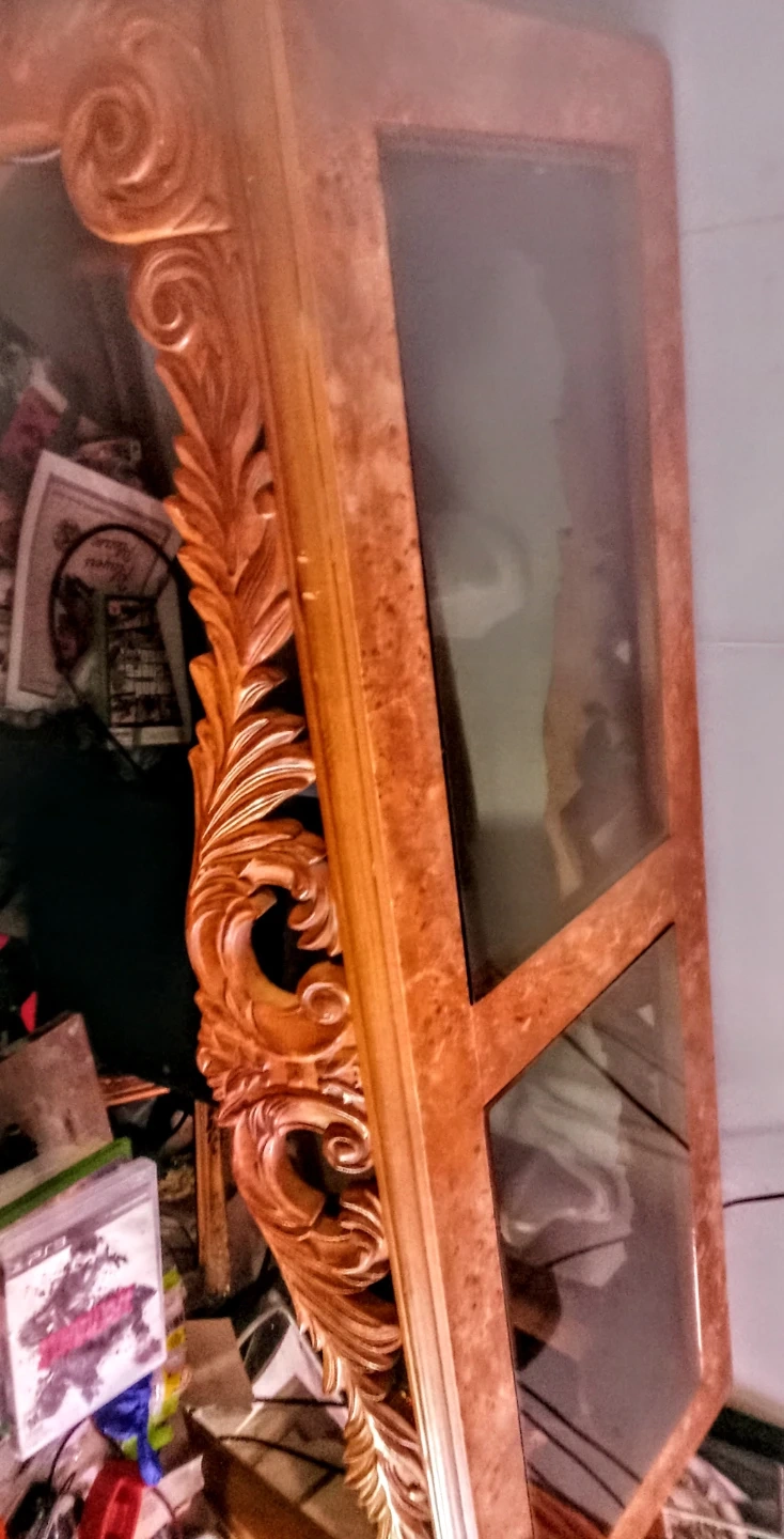 Selling an antique bird's-eye maple table with ornate wooden detailing. It features a glass top and a distinctive, eye-catching design. Perfect for adding a touch of elegance to your living room, office or entrance to your home or business.