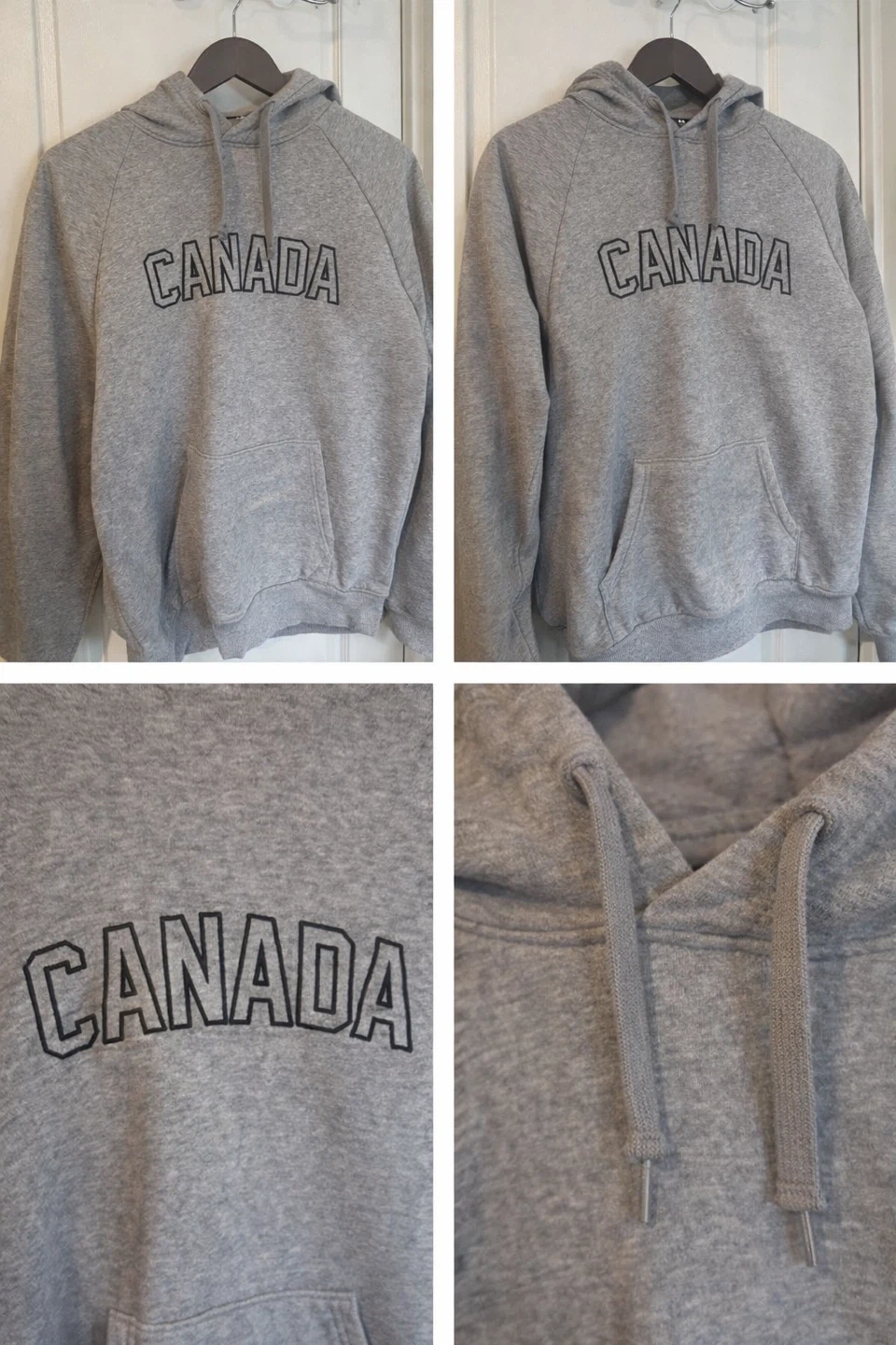 Grey hoodie with "Canada" graphic across the chest. It's a comfortable pullover style with a front pocket and drawstring hood. Made from a soft cotton blend.