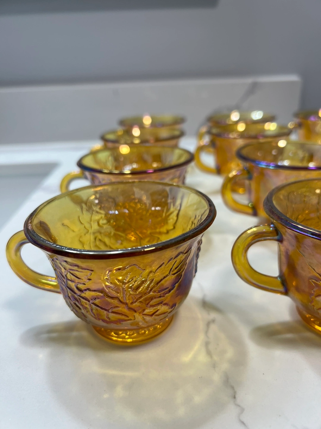 Here are some beautiful vintage Indiana Glass Harvest amber tea cups! They feature a lovely floral design and a unique iridescent finish. Perfect for adding a touch of retro charm to your tea time