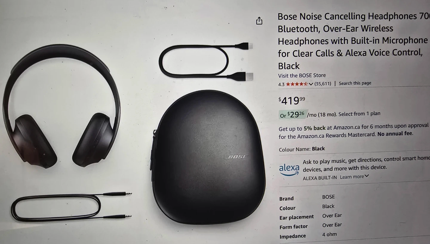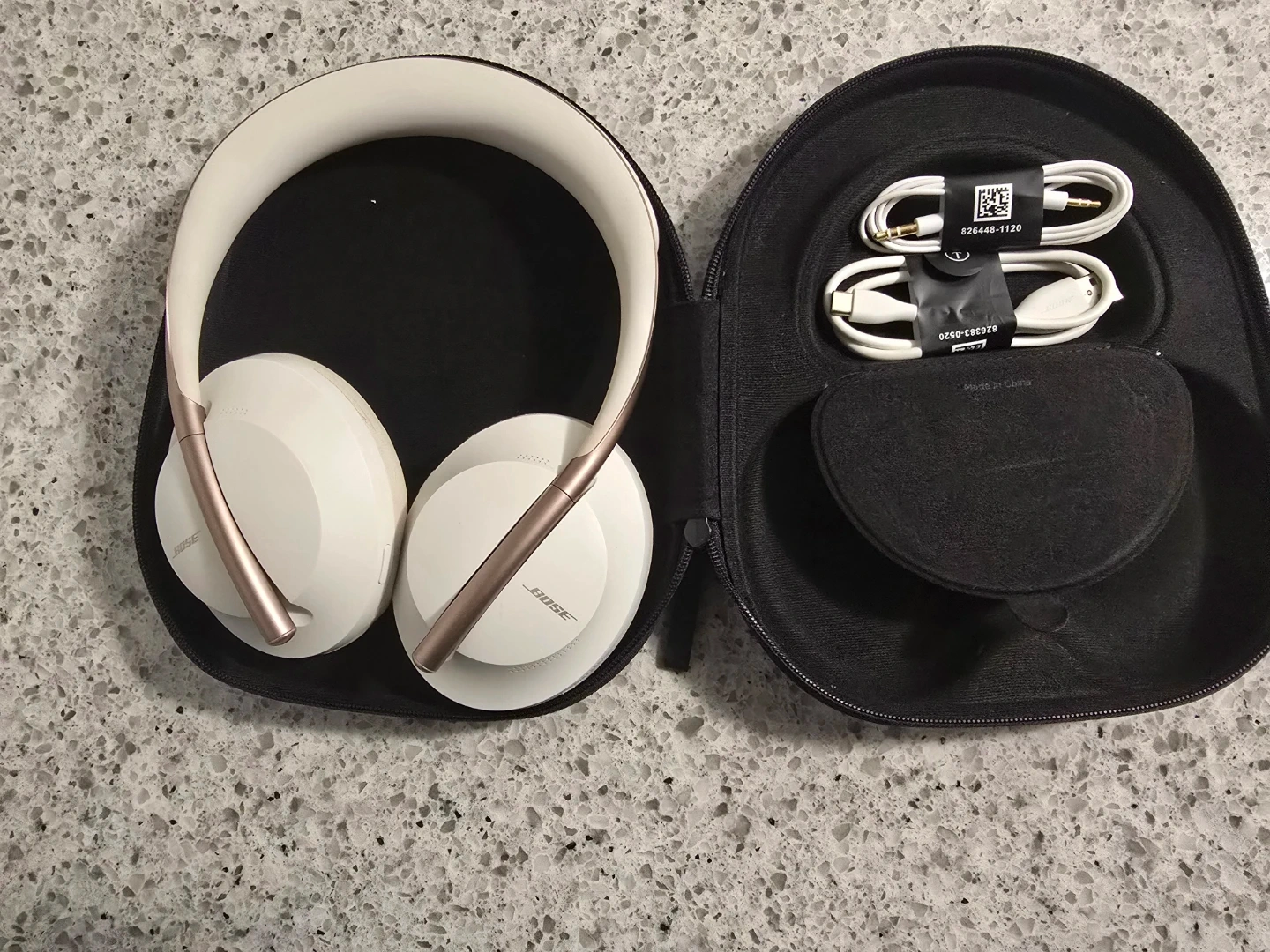 These are the Bose Noise Cancelling Headphones 700 in white with rose gold accents. They come with their original charging cable and audio cable, plus a protective carrying case. The earcups are comfortable for extended wear.