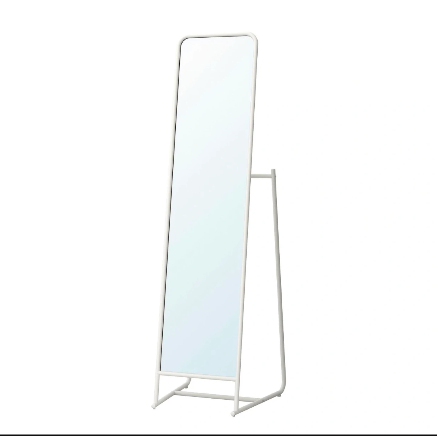 A modern white full-length standing mirror. Its simple design fits well in most rooms. Stands on a sturdy base for stability.