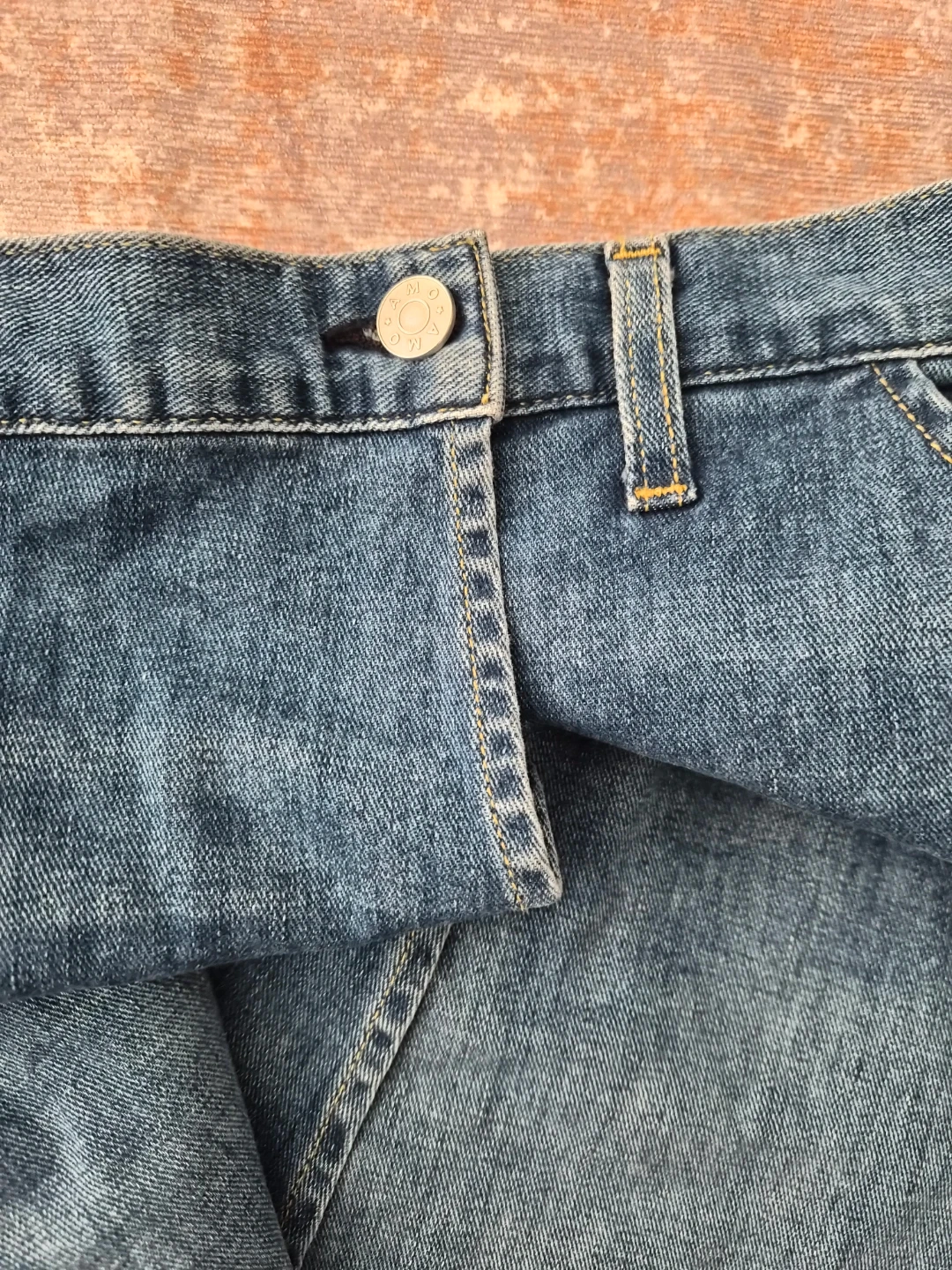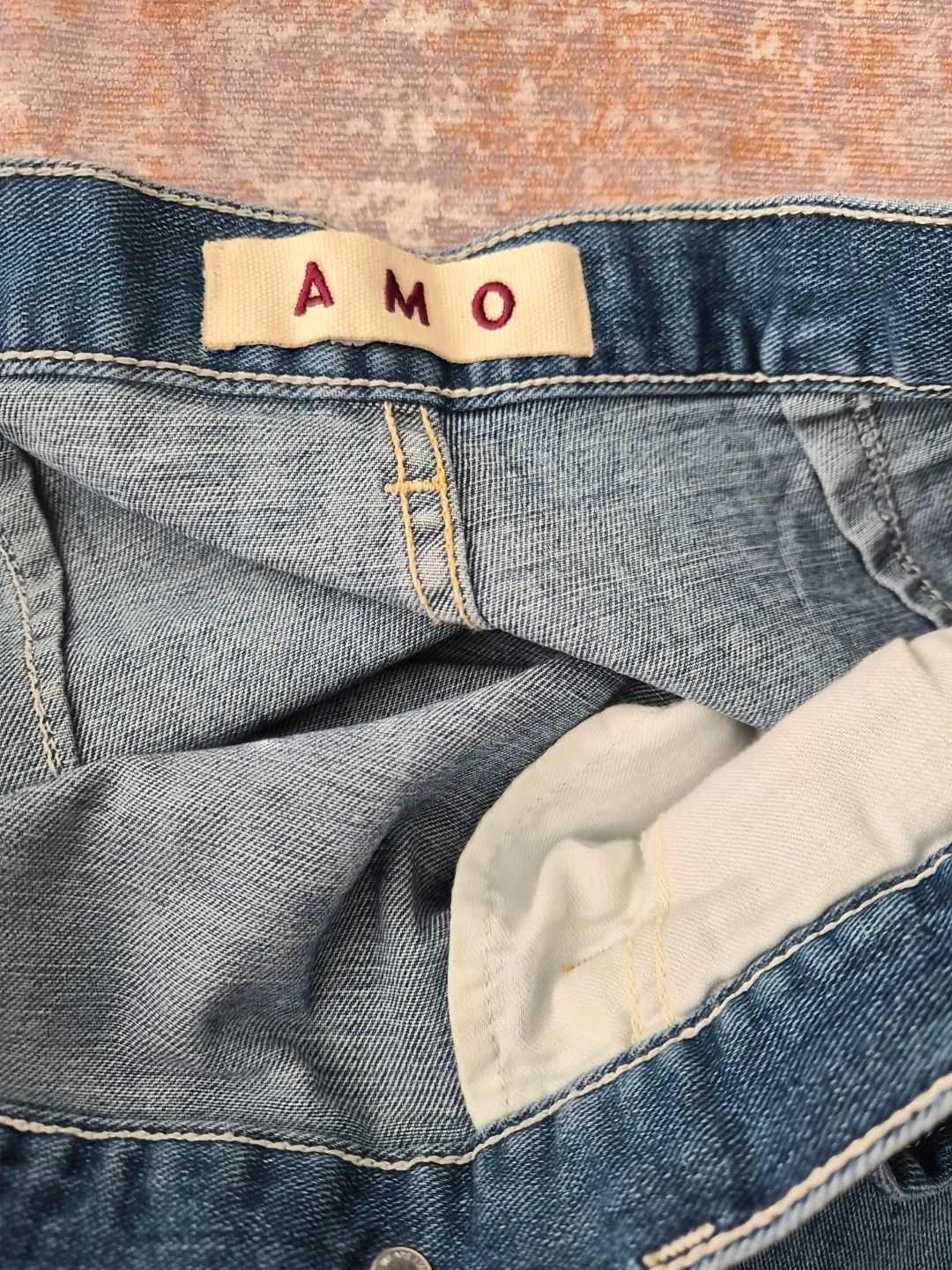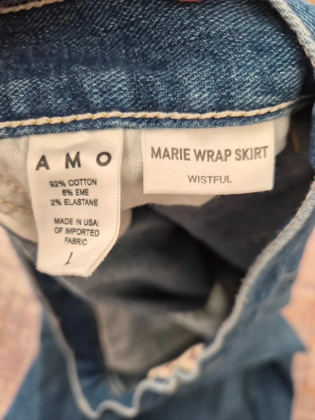 This is an AMO Marie Wrap Skirt in a 'Wistful' wash. It's made of 92% cotton, 6% EME, and 2% elastane. Made in the USA from imported fabric. NEW without tag