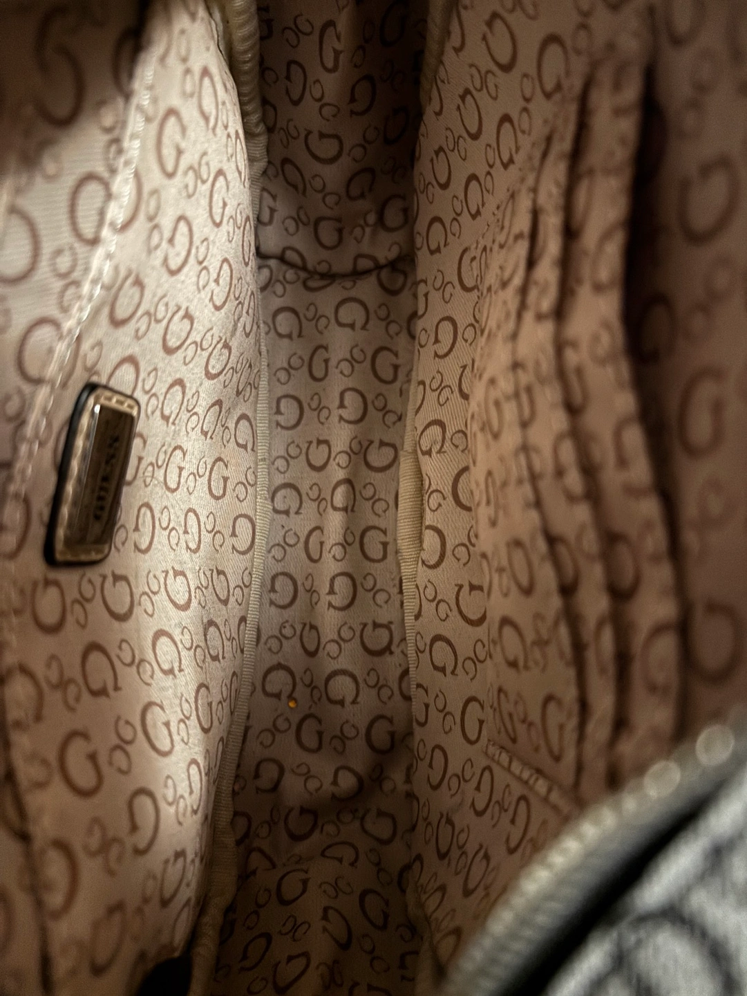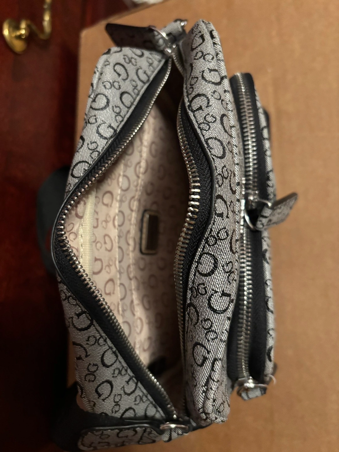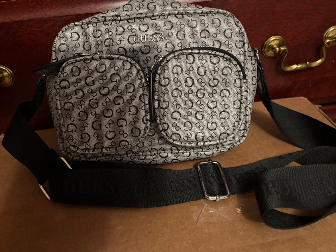 The bag is in very good condition. Almost new. Fairly good size cross body. Two pockets with zippers. Charming and comfy with large and adjustable black strap.