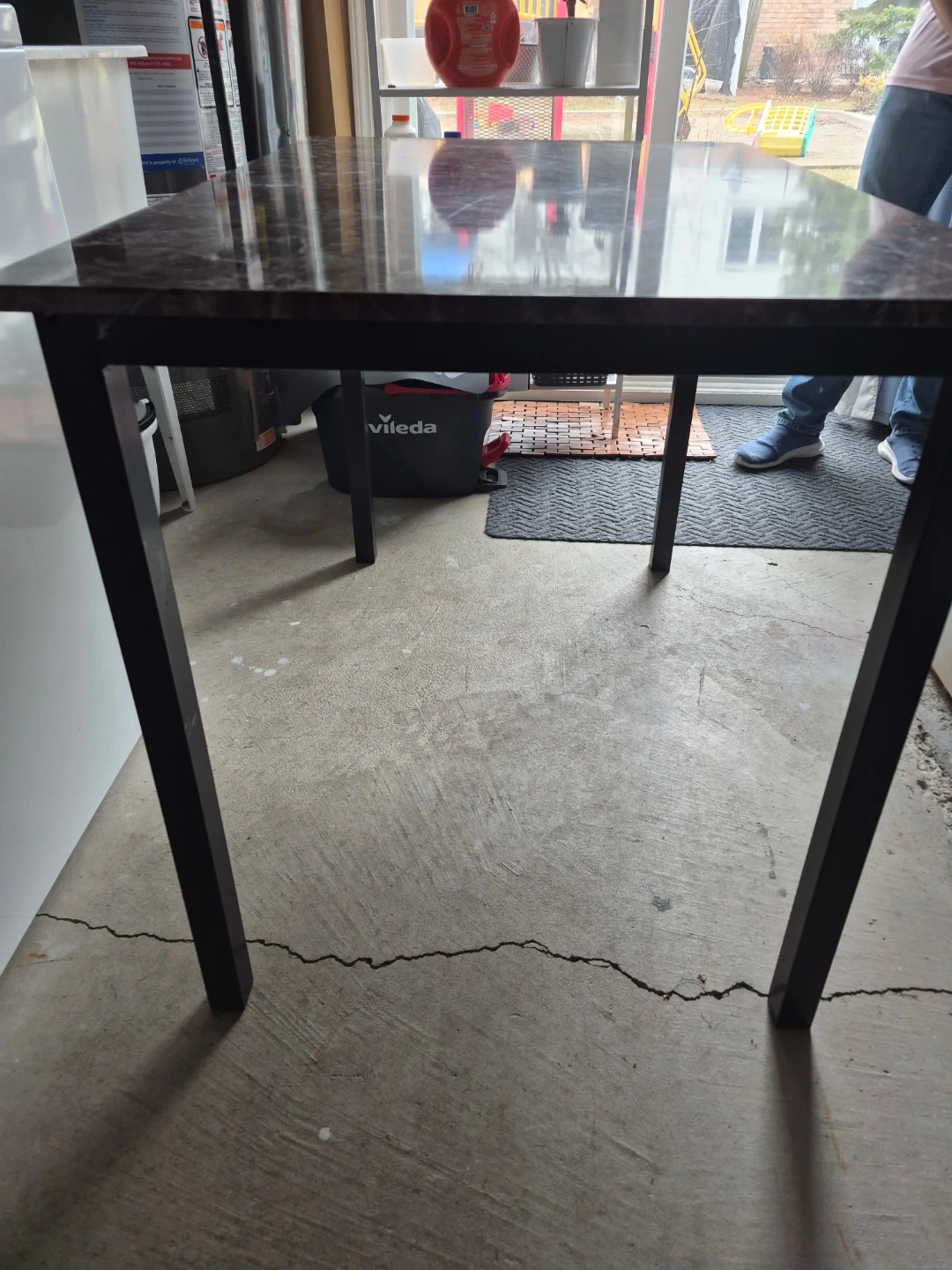 This is a dining table with a marble-look top and black metal legs. It's a great size for smaller spaces. The surface is easy to wipe clean.