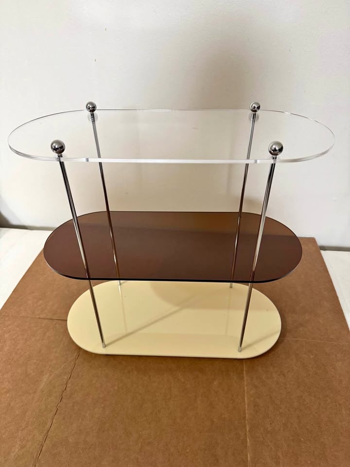 Great for displaying perfume collections, makeup, skincare, coffee mugs, or small collectibles. Features clear, amber (caramel), and cream acrylic tiers with sleek chrome supports. 100% Brand New. Dimensions: 15.7" L x 6.7" W x 13.4" H (40cm x 17cm x 34cm). Pick up only near Markville Mall.