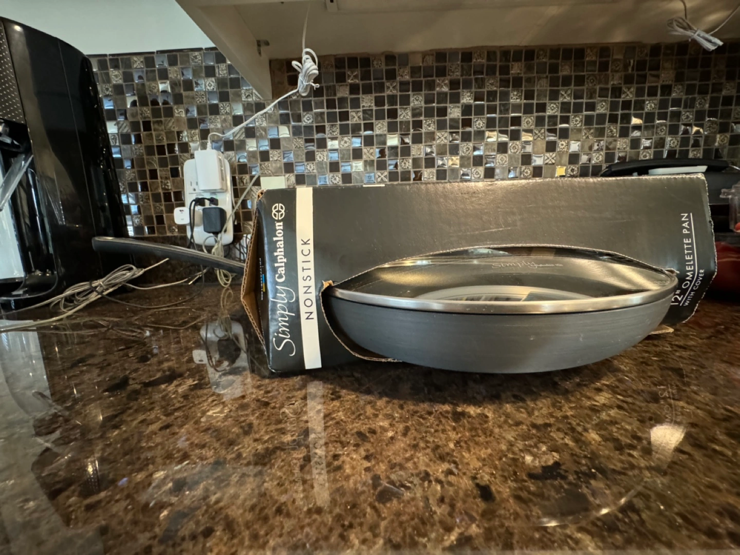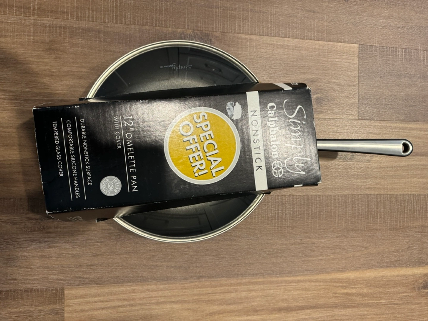 New in box Simply Calphalon nonstick omelette pan. 12-inch pan with tempered glass cover. Durable nonstick surface. Comfortable silicone handles.
