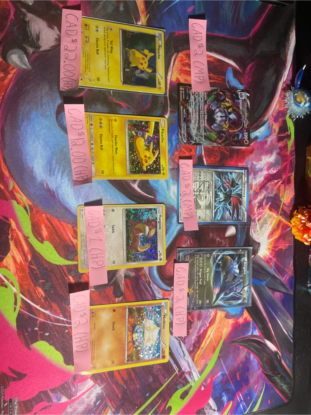Collection of Pokémon cards including Pikachu, Yungoos, Meditite, Kingdra, Skarmory, and Chandelure. Prices vary per card. But I will do everything for 32. I can negotiate.
