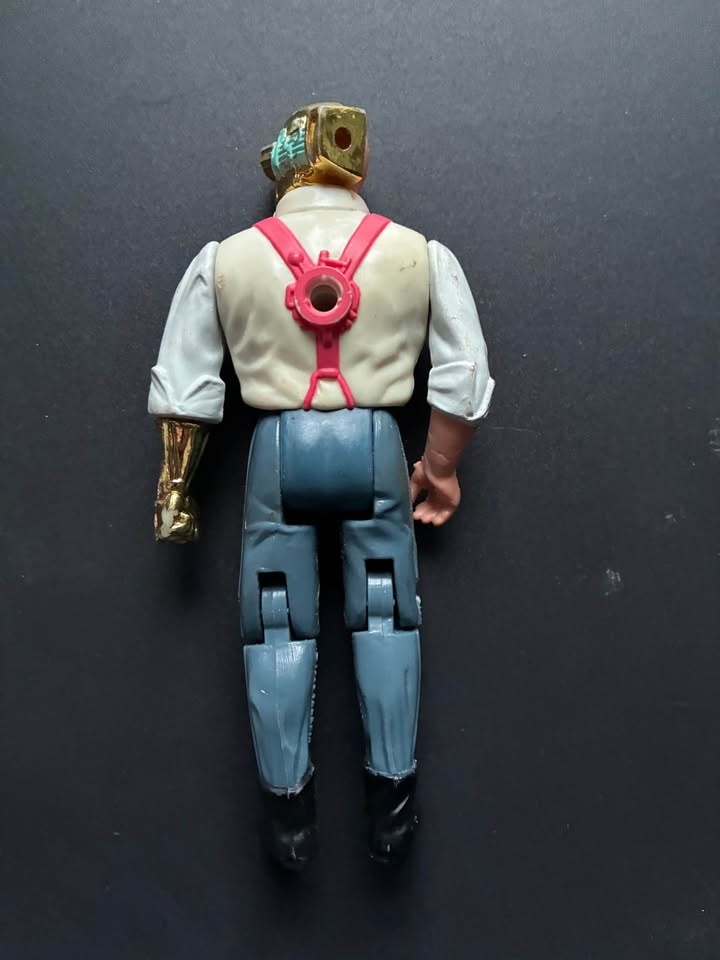 This is a vintage 1986 Kenner SilverHawks Stargazer action figure. The figure features a gold-colored bionic arm and a robotic head. The character is Commander Stargazer, a no-nonsense galactic lawman.