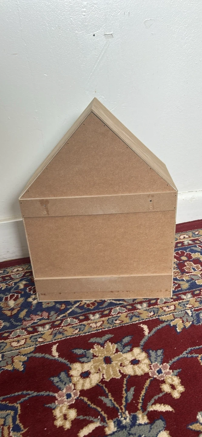 This is a cute house-shaped shelf. It has a white interior and a wood-grain exterior. Perfect for displaying small items!