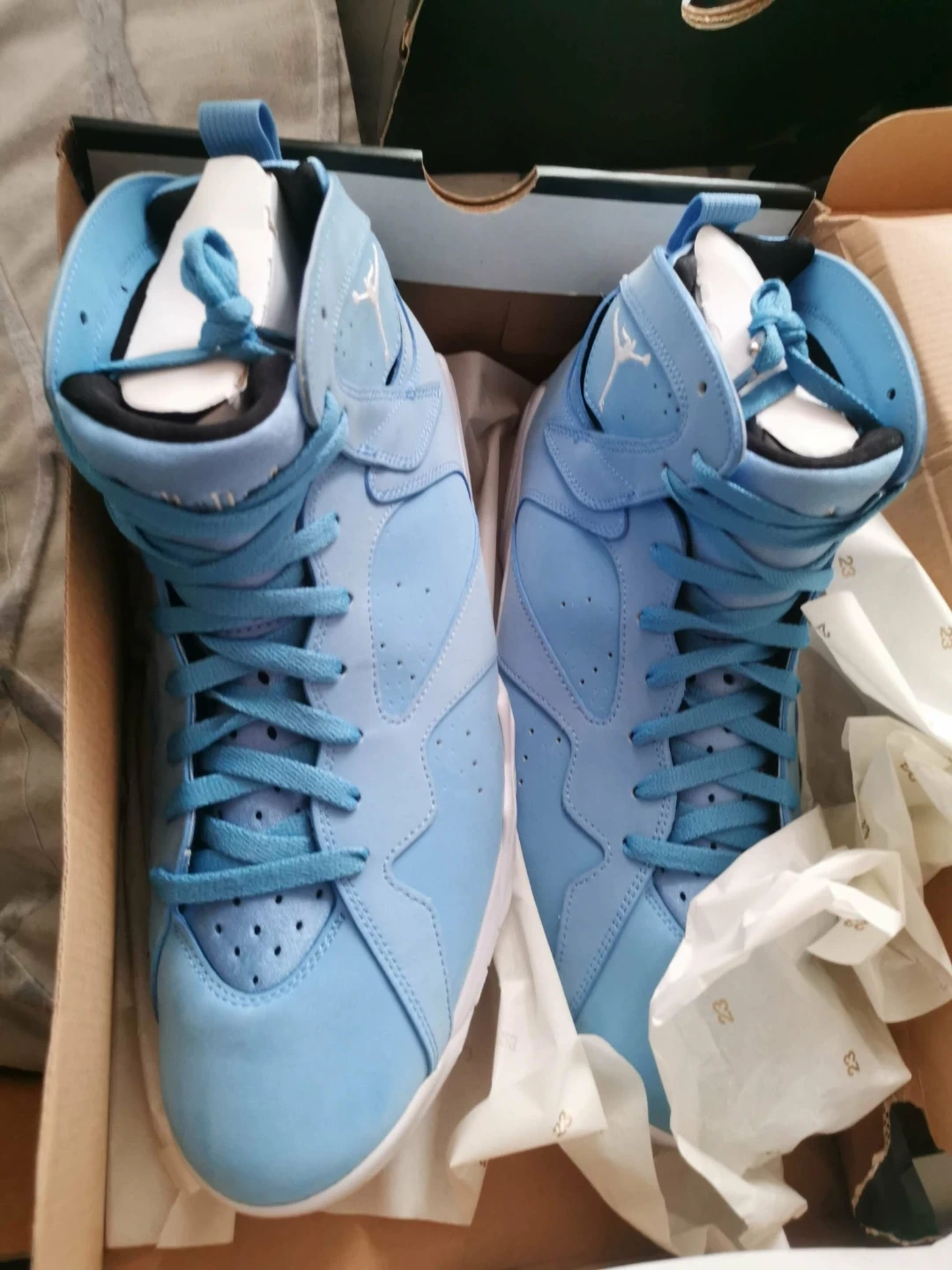 Baskets Air Jordan 7 dans une teinte bleu clair. Elles viennent dans leur boîte d'origine. Style classique et confortable.
