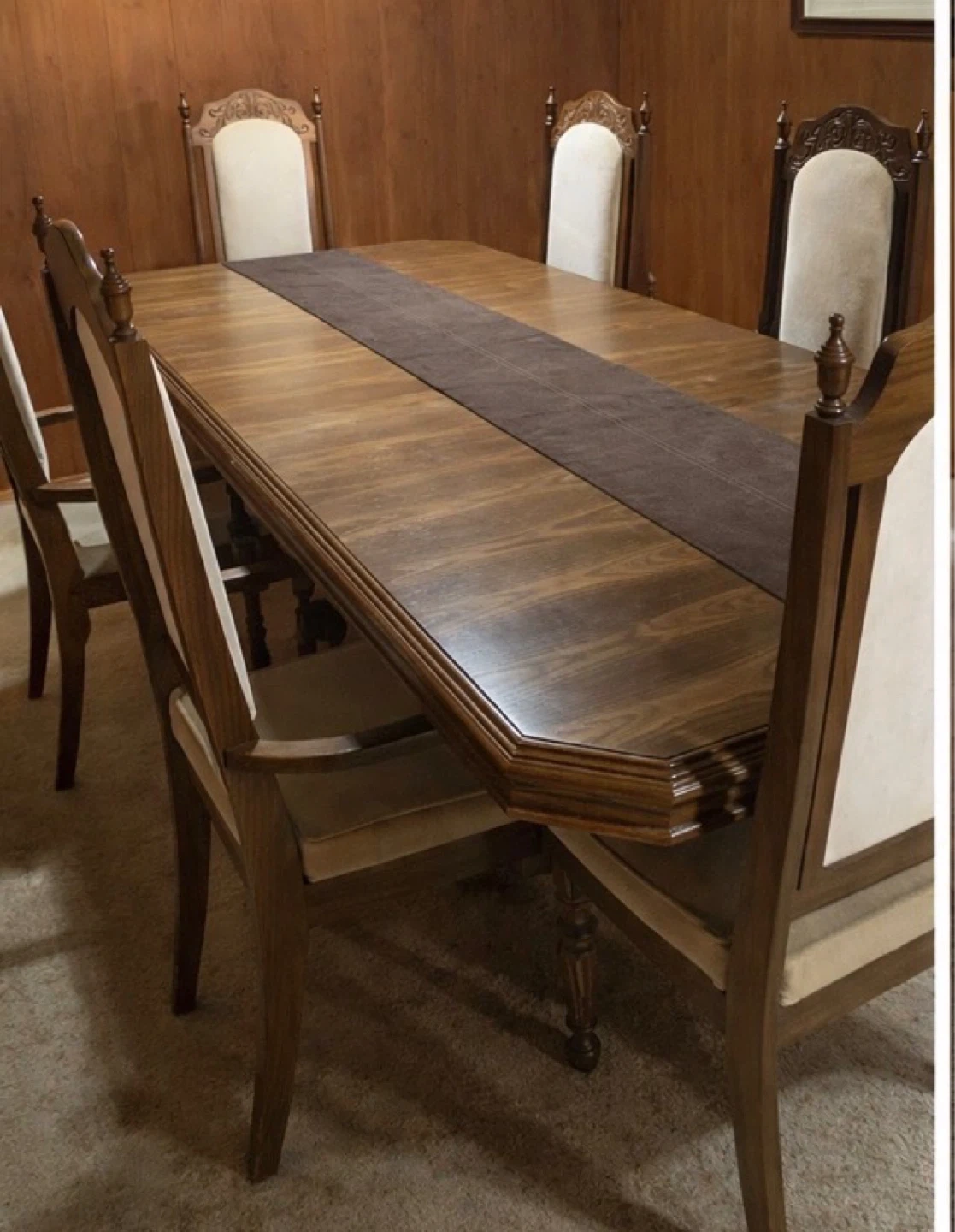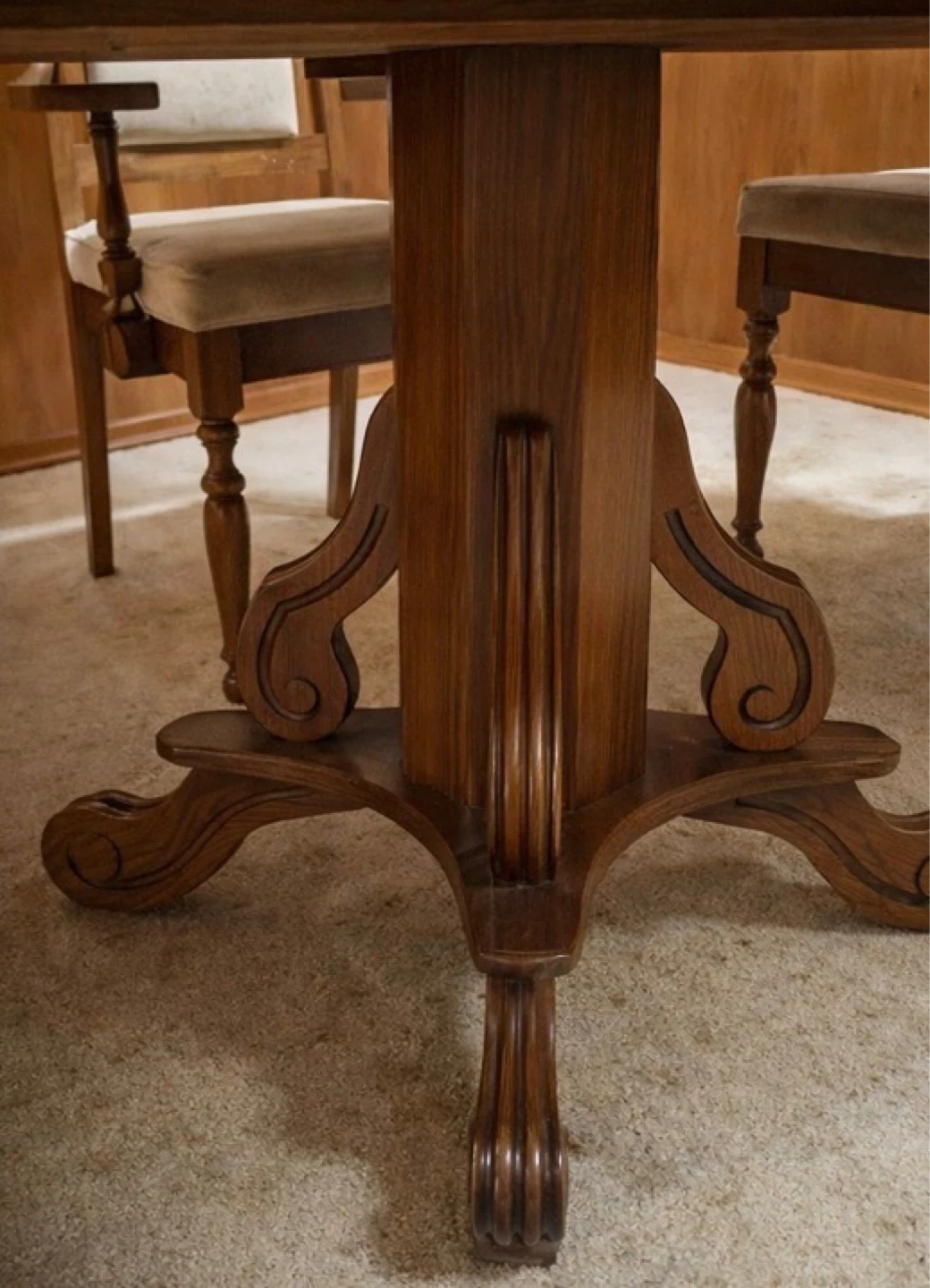 Beautiful vintage dining table over 40 years old with classic carved base and detailed chairs. Solid, sturdy piece with lots of character.