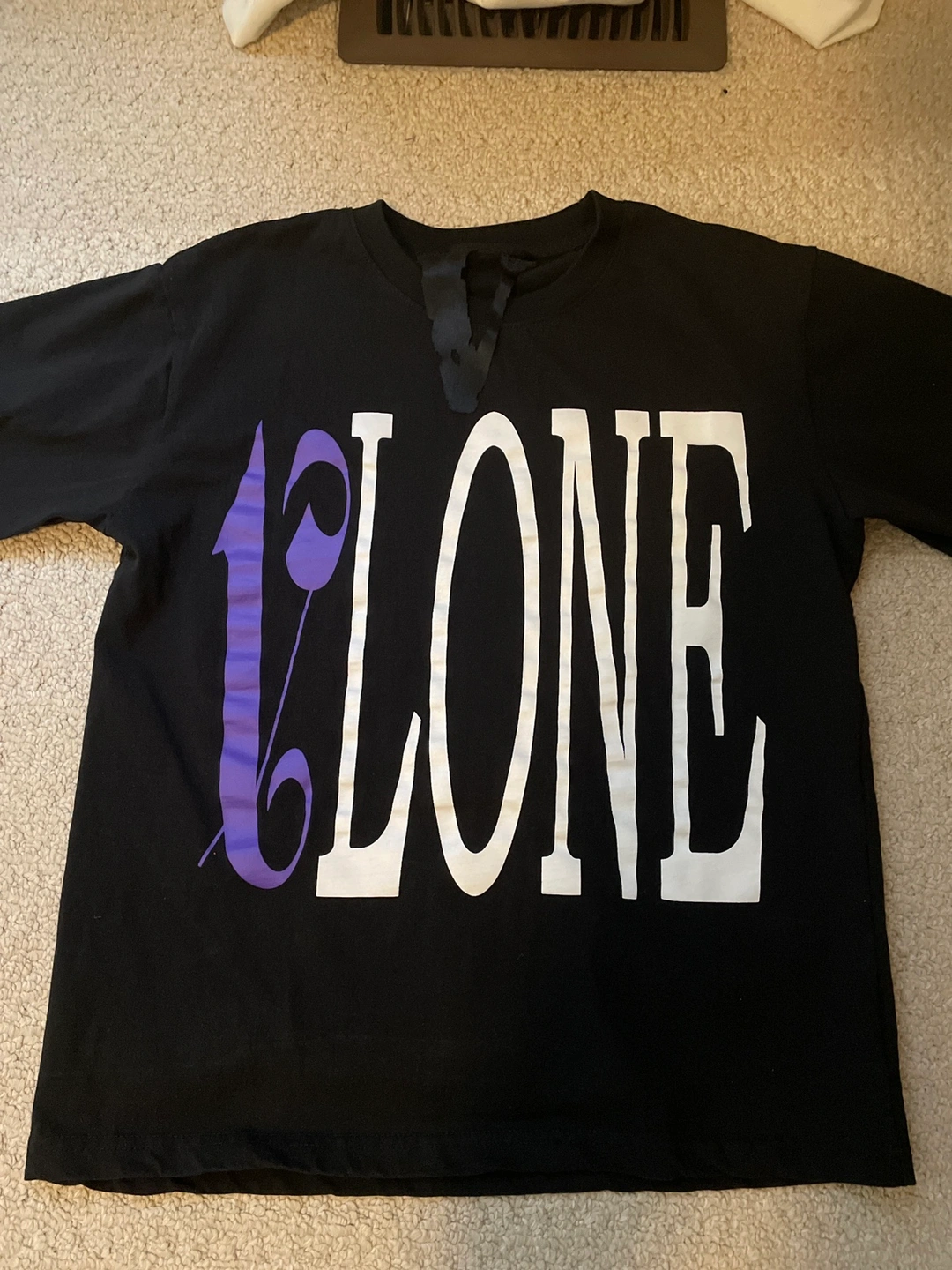 Black T-shirt with purple and white graphic on front and back. The t-shirt is short sleeved. The neck has a V-shaped cut. The back of the shirt has "Palm Angels" written in white and a purple flame graphic. The front has the "1017 ALYX 9SM" logo in a white and purple graphic. The shirt is 100% cotton. It is in good condition.
