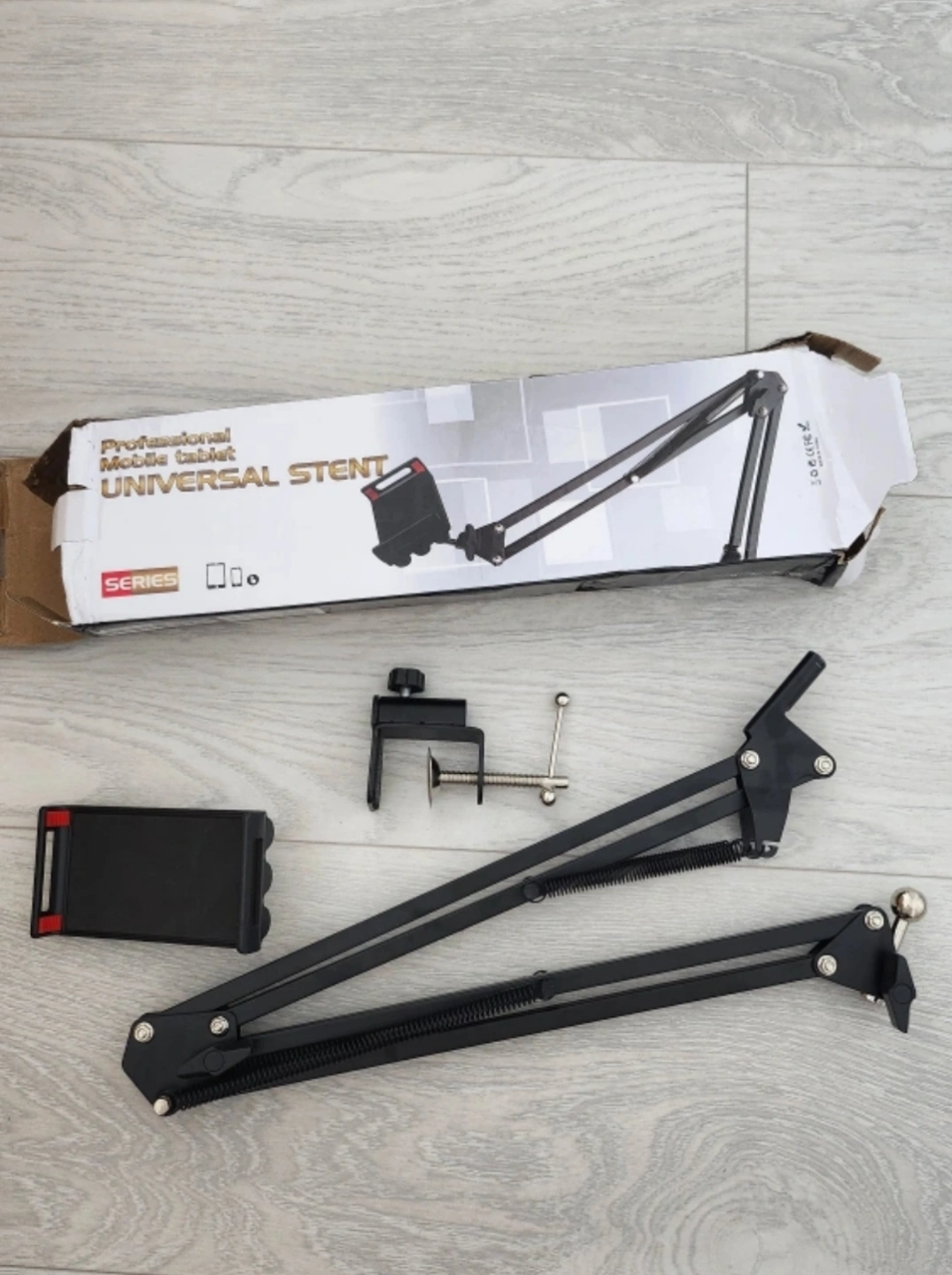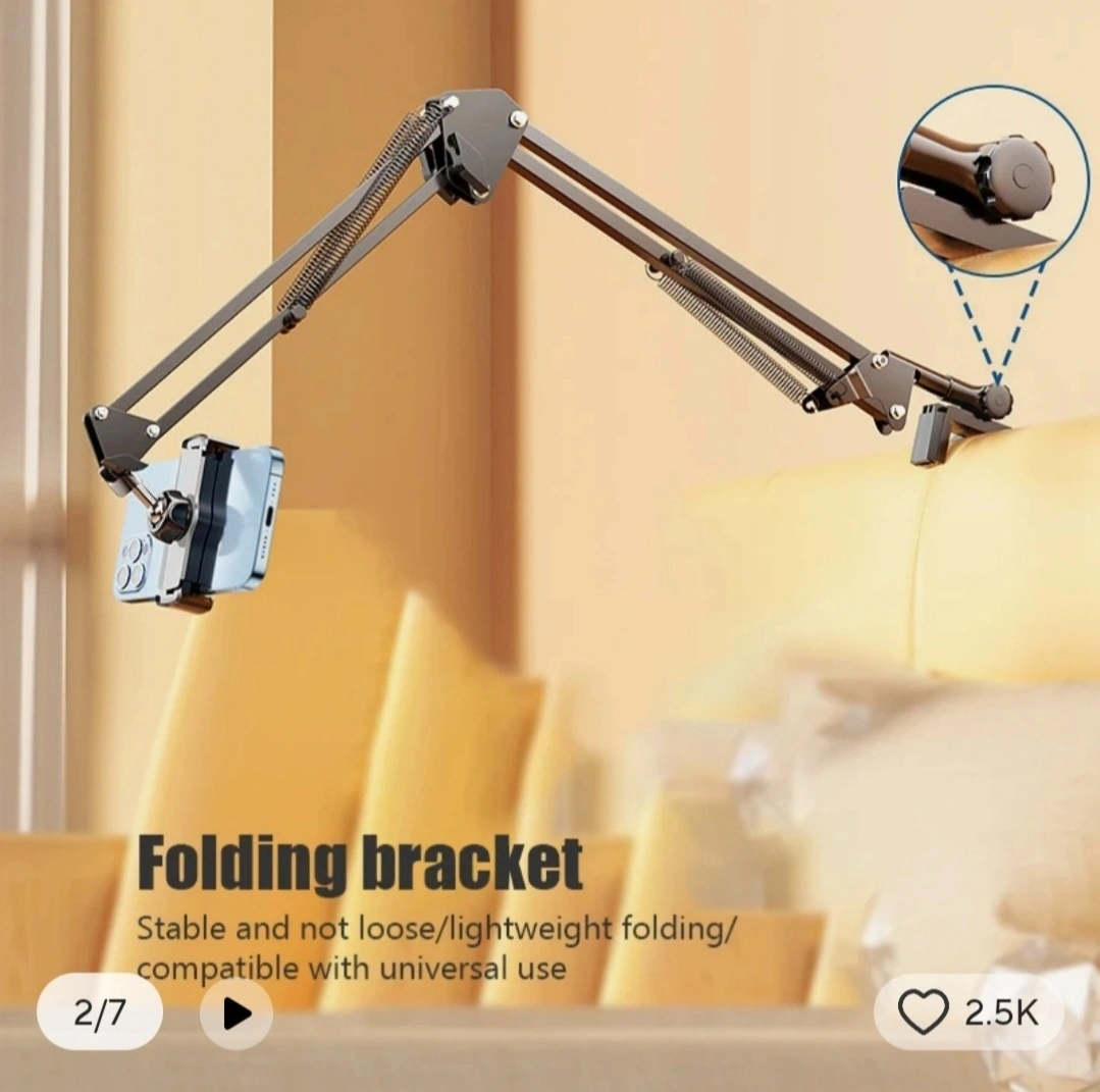 360° rotating long arm phone and tablet holder. Overhead stand, works on desks or beds. Angle adjustable, foldable and portable. Compatible with Huawei, Xiaomi, iPhone and iPad. Includes clamp.