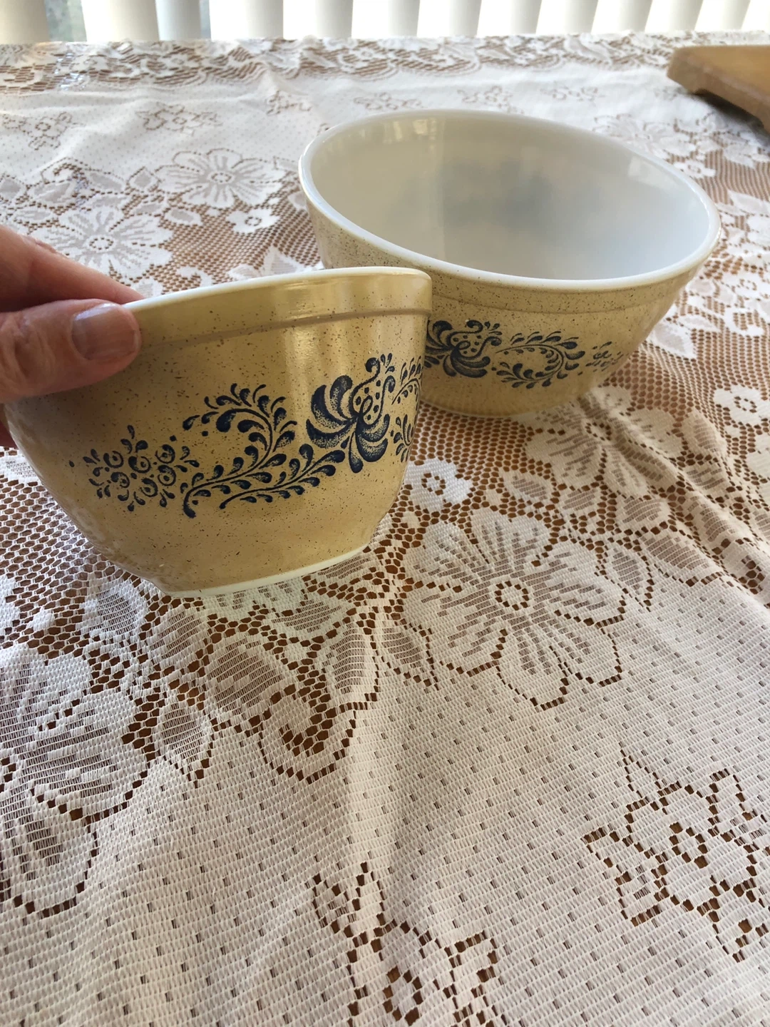 Selling a set of two vintage Pyrex bowls! They have a lovely floral pattern in blue on a tan/beige background. Perfect for adding a touch of retro charm to your kitchen!