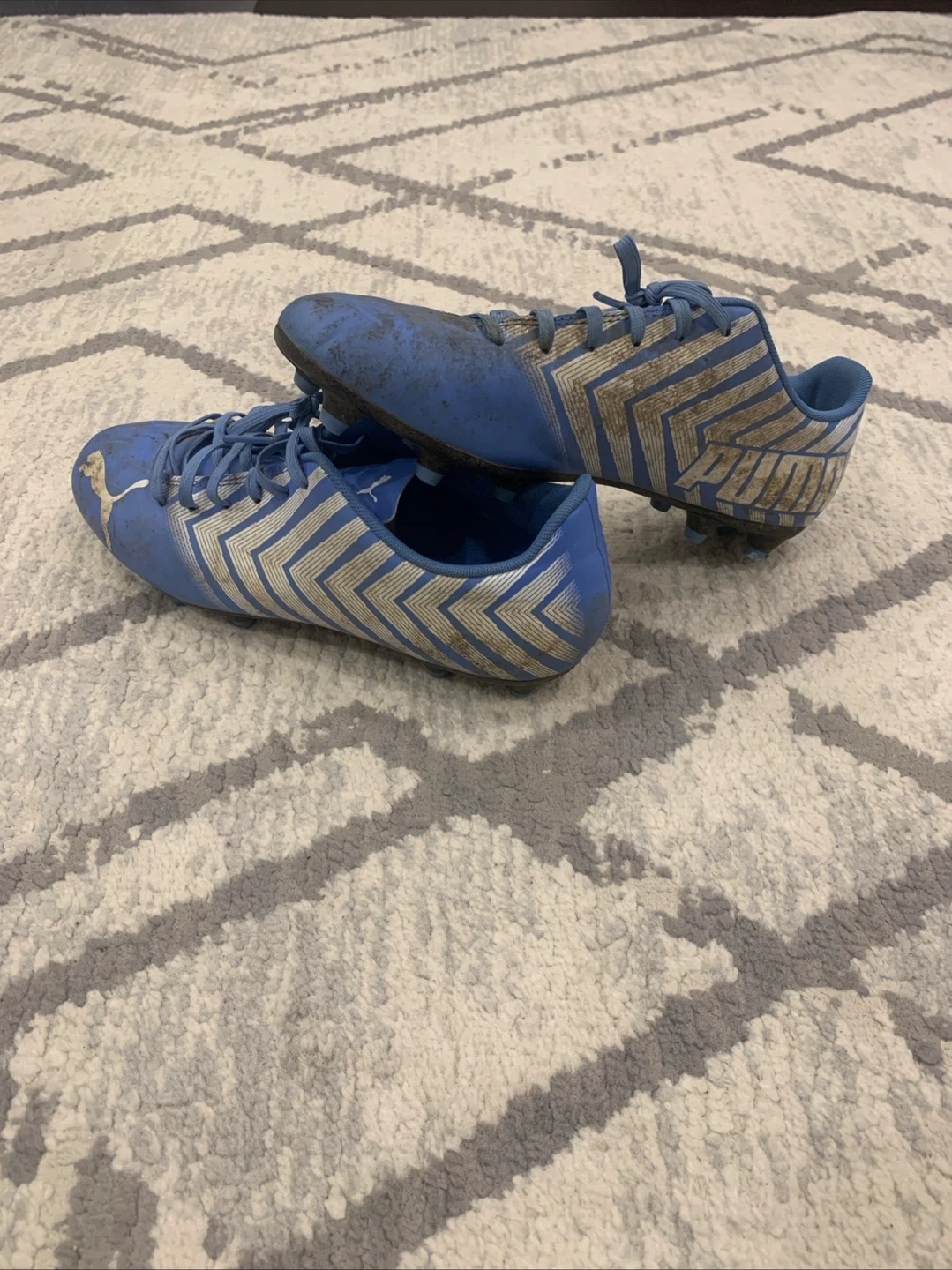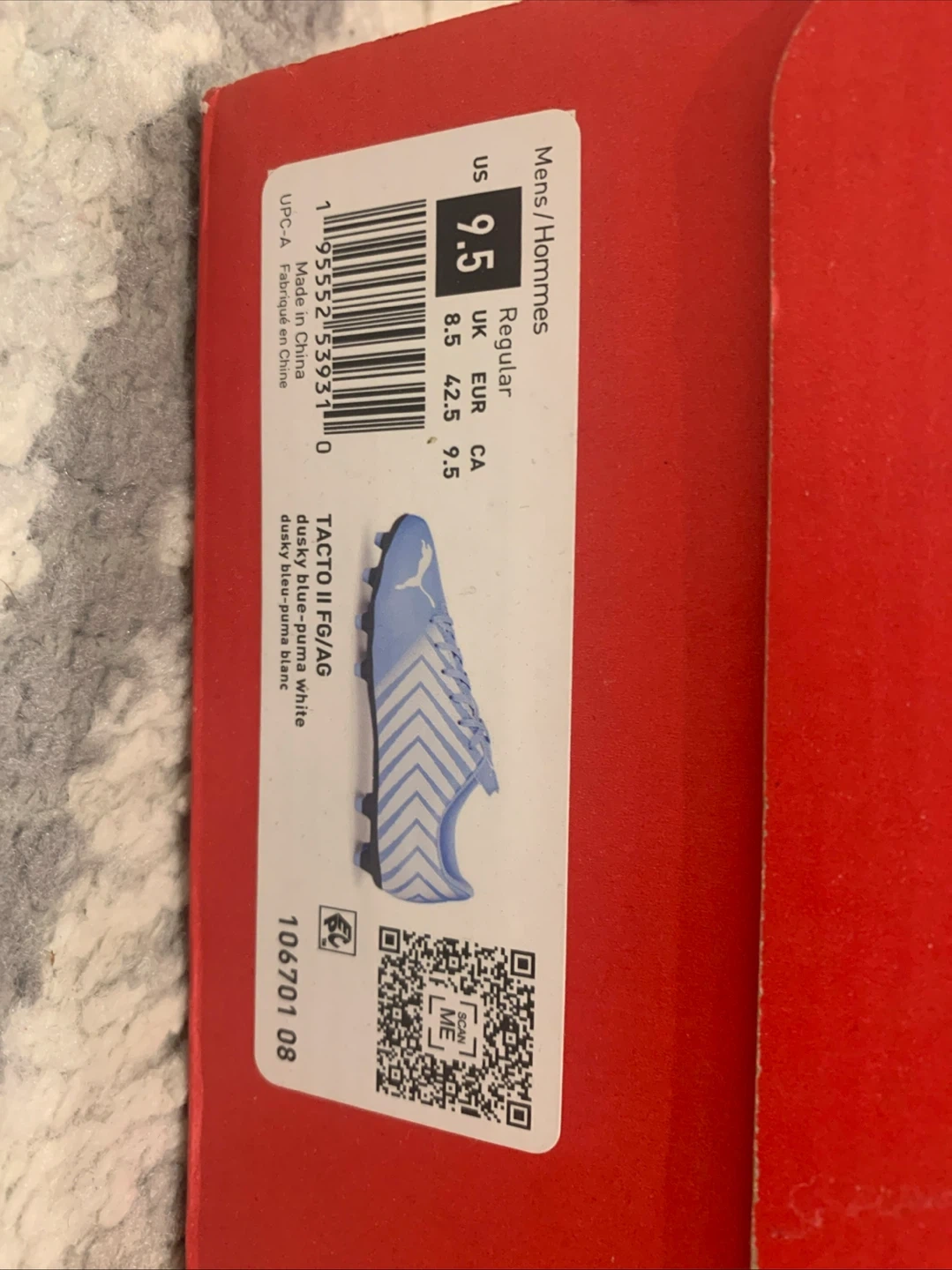 These Puma TACTO II FG/AG soccer cleats are a size 9.5 in dusky blue-puma white. They're designed for firm ground or artificial grass play. These cleats are ready for the field!