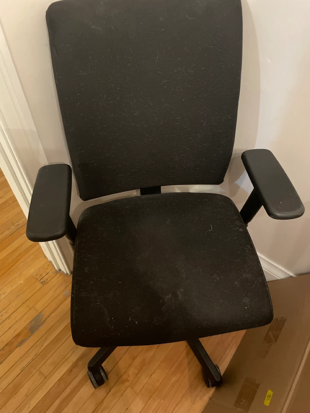 This is a black fabric office chair. It has padded armrests and a five-wheel base for easy movement. It's designed for comfortable seating. It’s works perfectly but a little ware on the seat. Wish I could keep it but too big for my new place.