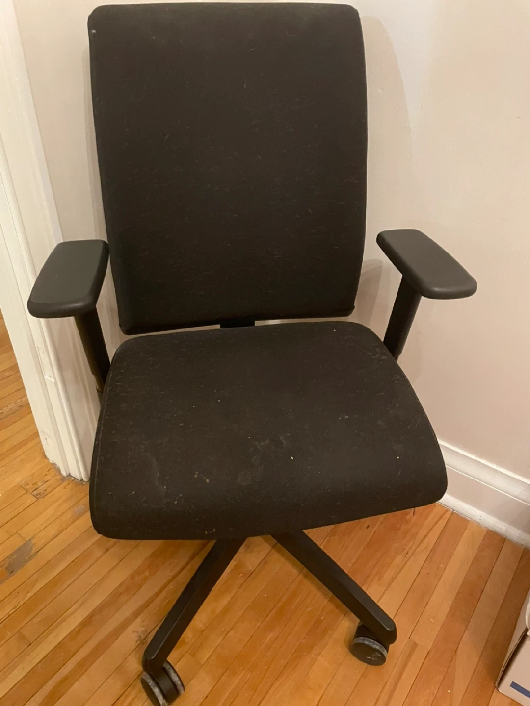 This is a black fabric office chair. It has padded armrests and a five-wheel base for easy movement. It's designed for comfortable seating. It’s works perfectly but a little ware on the seat. Wish I could keep it but too big for my new place.