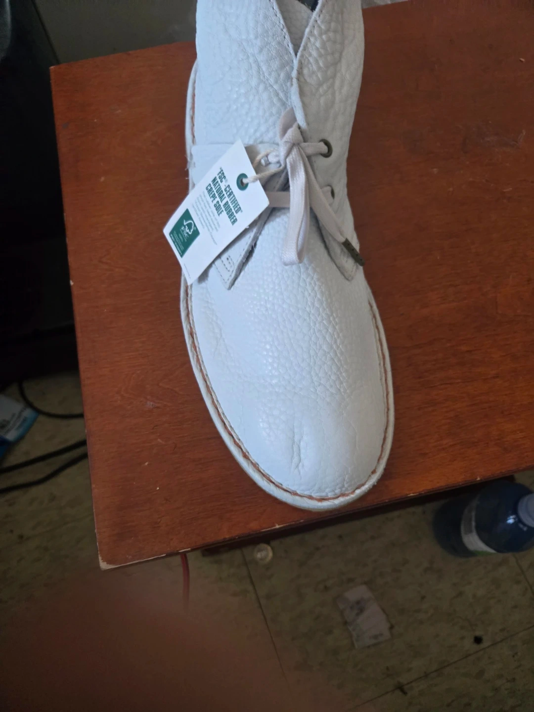 Selling a pair of white leather Clarks Desert Boots! They have a natural rubber crepe sole and are FSC certified. These boots are super stylish and comfortable, perfect for everyday wear