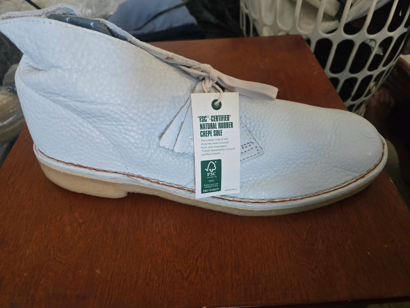 Selling a pair of white leather Clarks Desert Boots! They have a natural rubber crepe sole and are FSC certified. These boots are super stylish and comfortable, perfect for everyday wear
