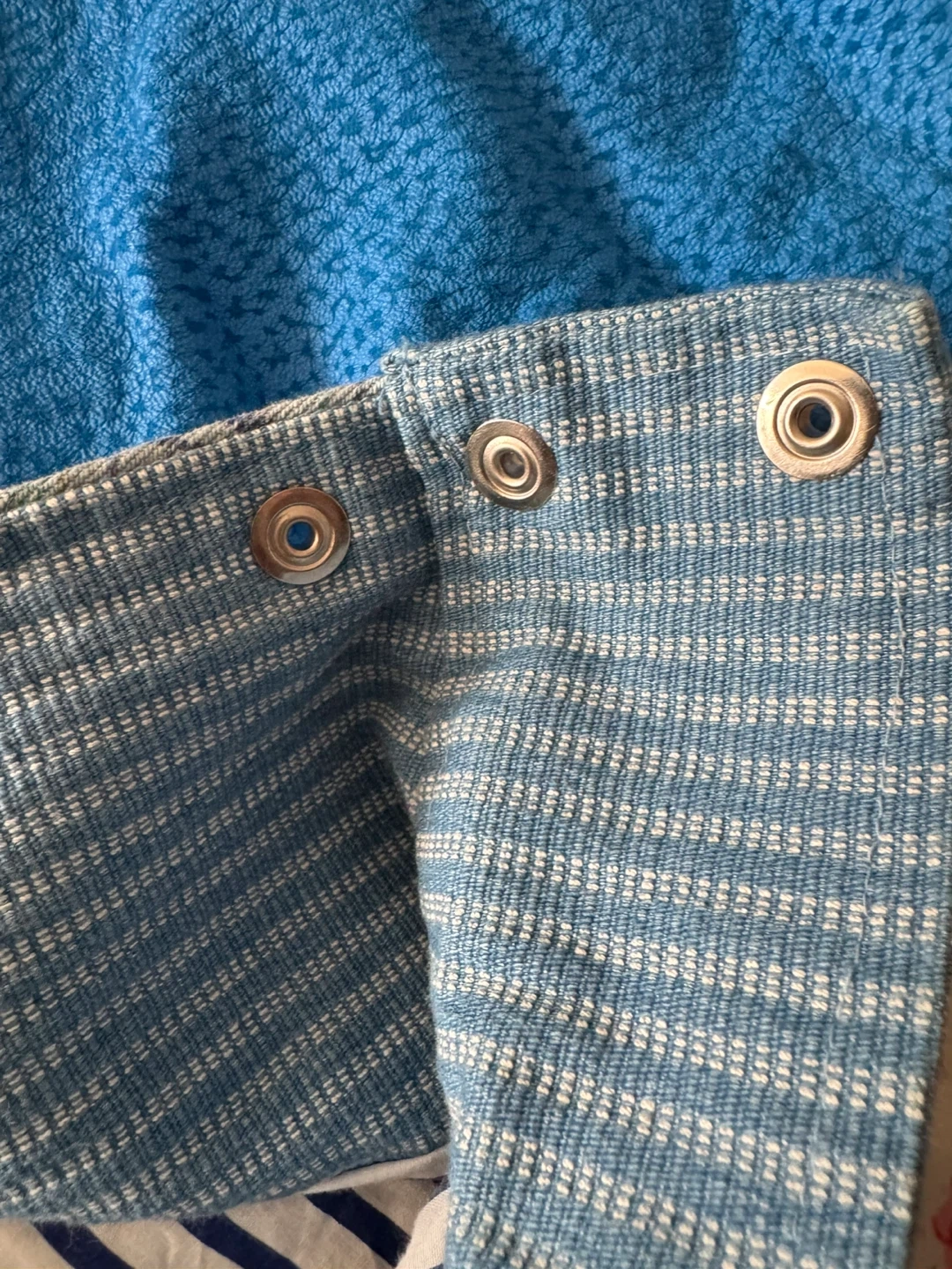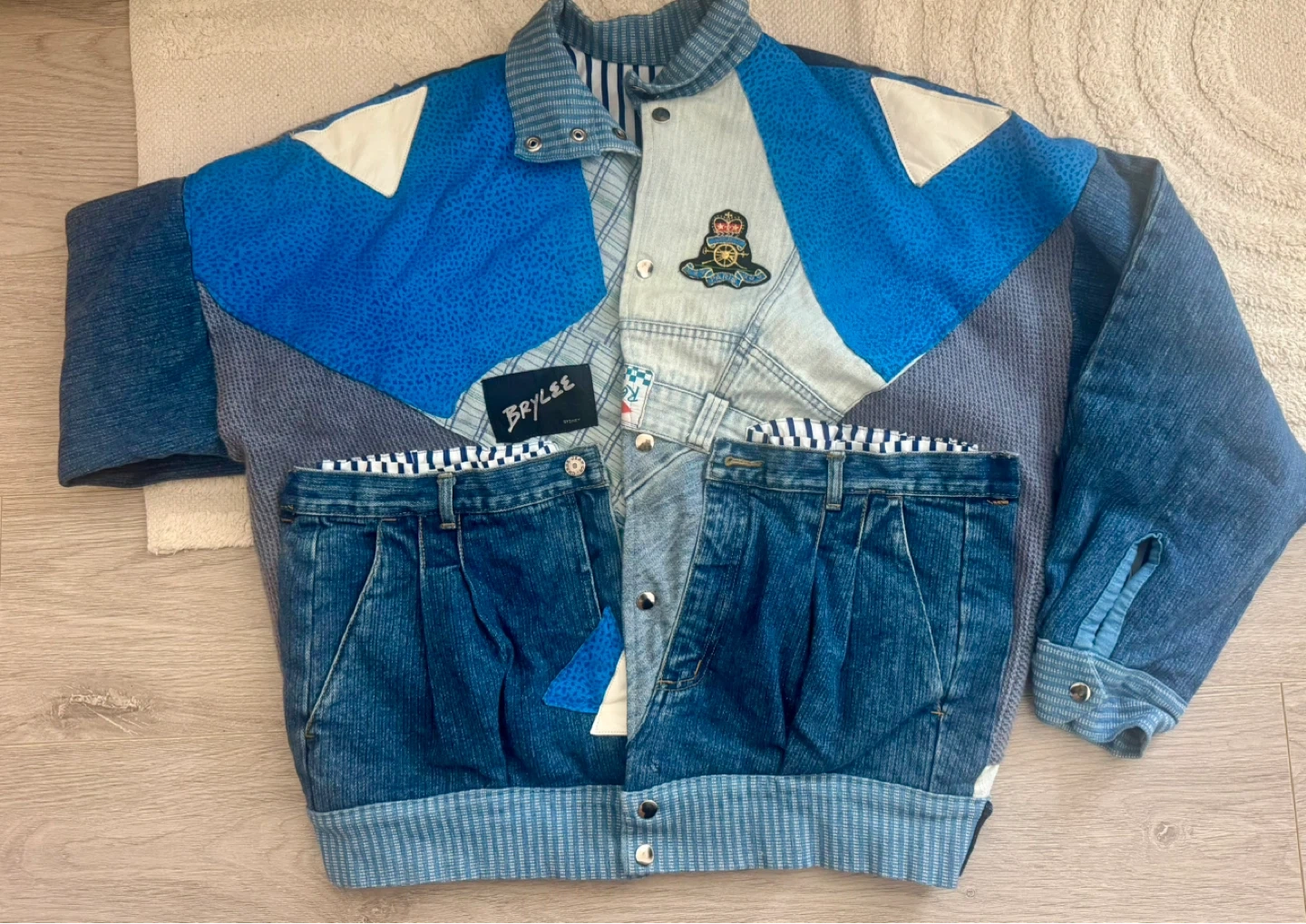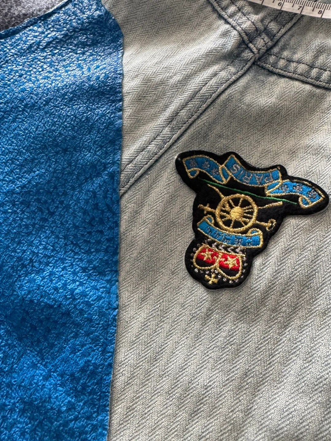 • Design: Multi-panel construction combining light and dark denim, waffle-knit, and cobalt textured fabrics.