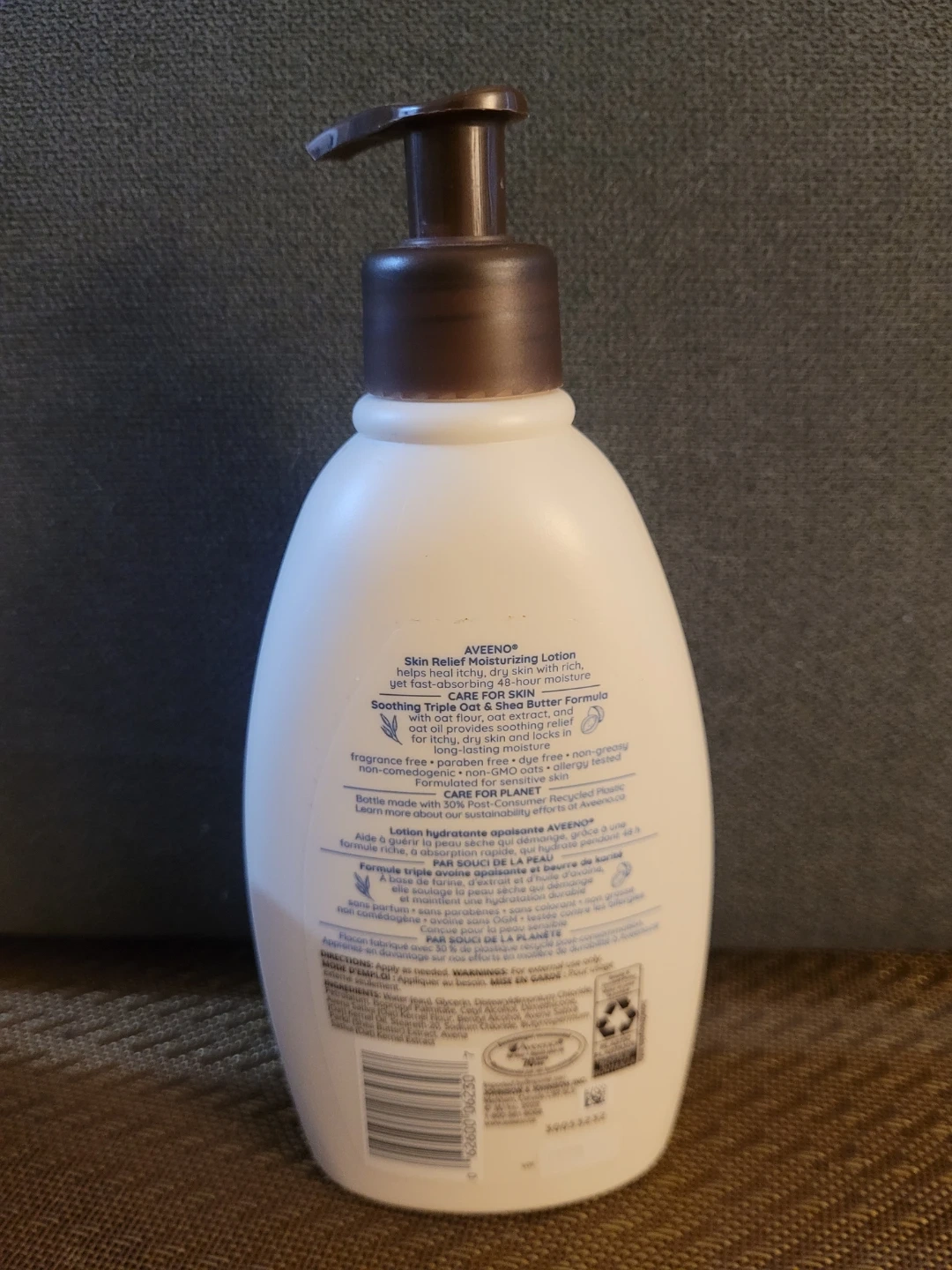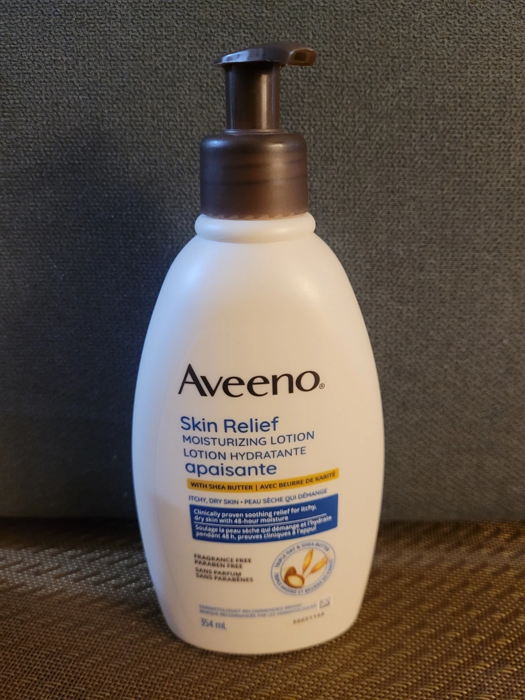 Aveeno Skin Relief Moisturizing Lotion with Shea Butter. Helps heal itchy, dry skin with rich, emollient ingredients. Long-lasting moisture for sensitive skin. 354 ml bottle.