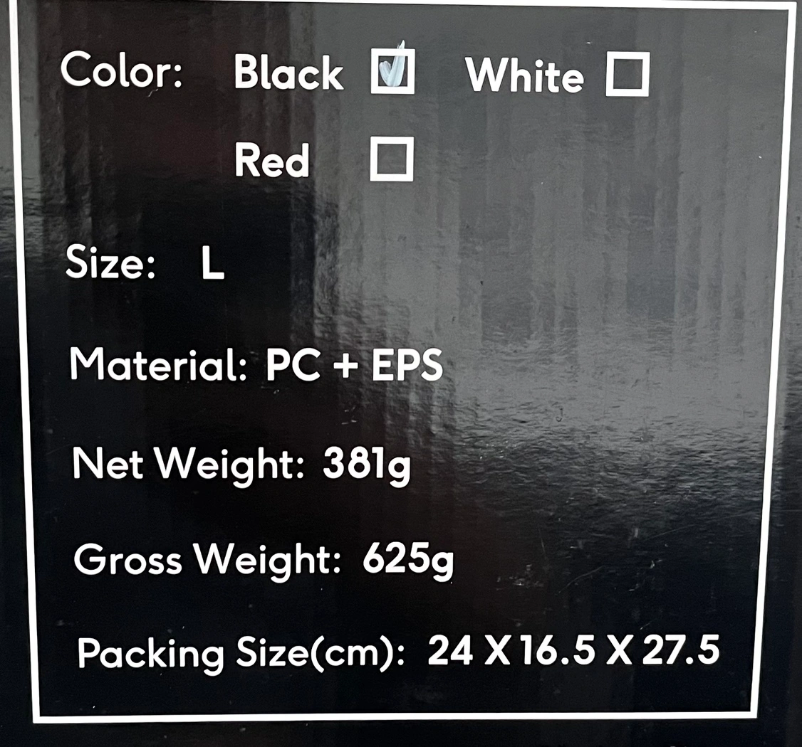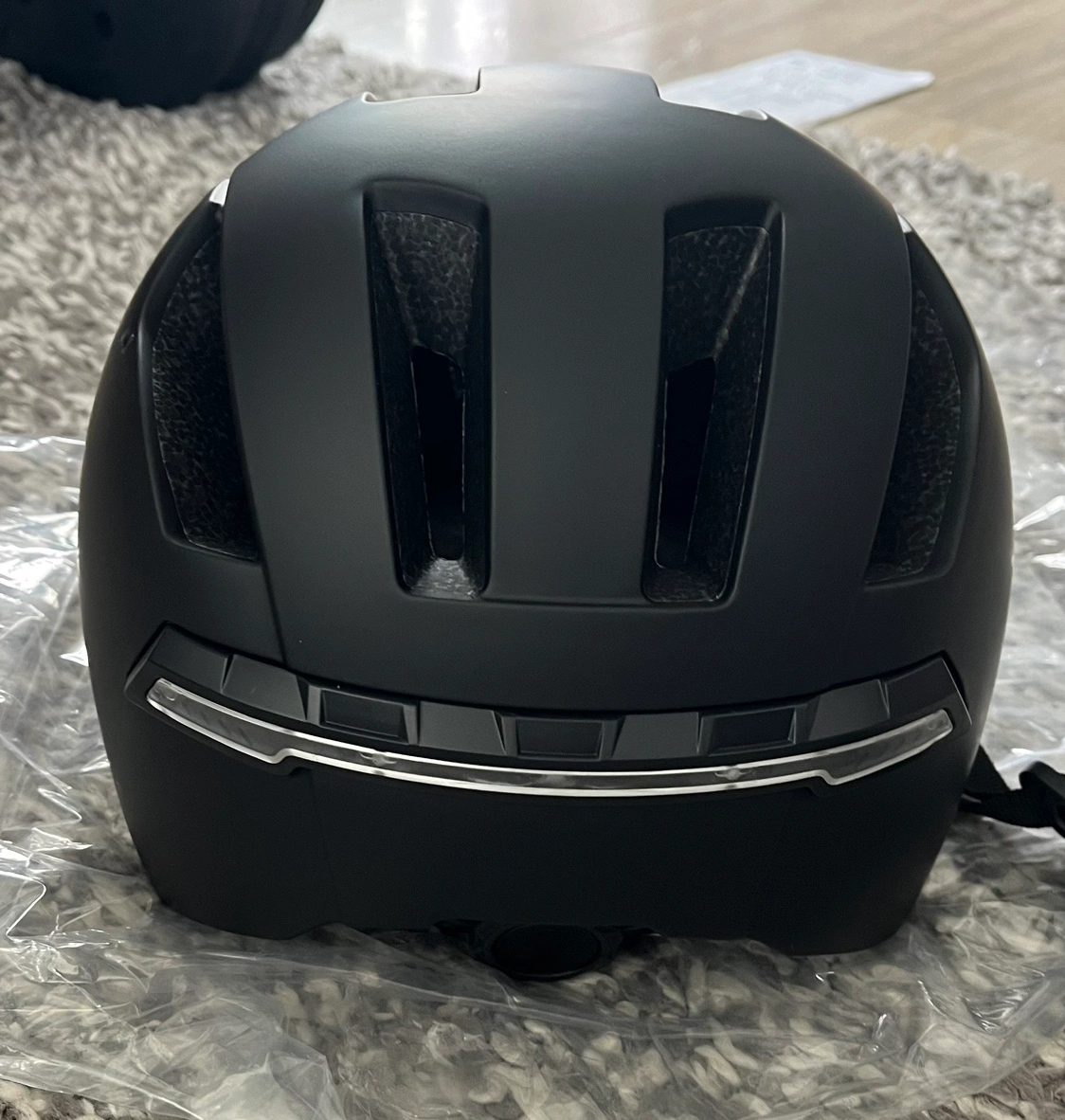 Black bicycle helmet with built-in lights and turn signals. Comes with charging cable and user manual. Still into box