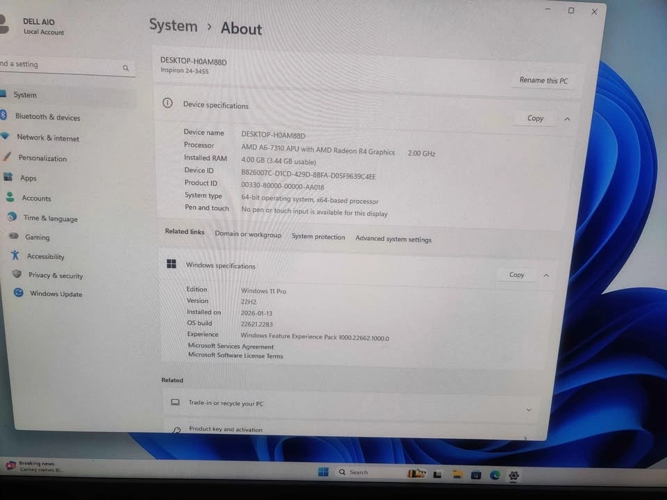 Functional Dell Inspiron 24-3455 All-in-One PC. Features an AMD A6-7310 APU processor with Radeon R4 Graphics and 4GB RAM, 500G HDD. Running Windows 11 Pro (64-bit). White color. Let me know if you're interested!