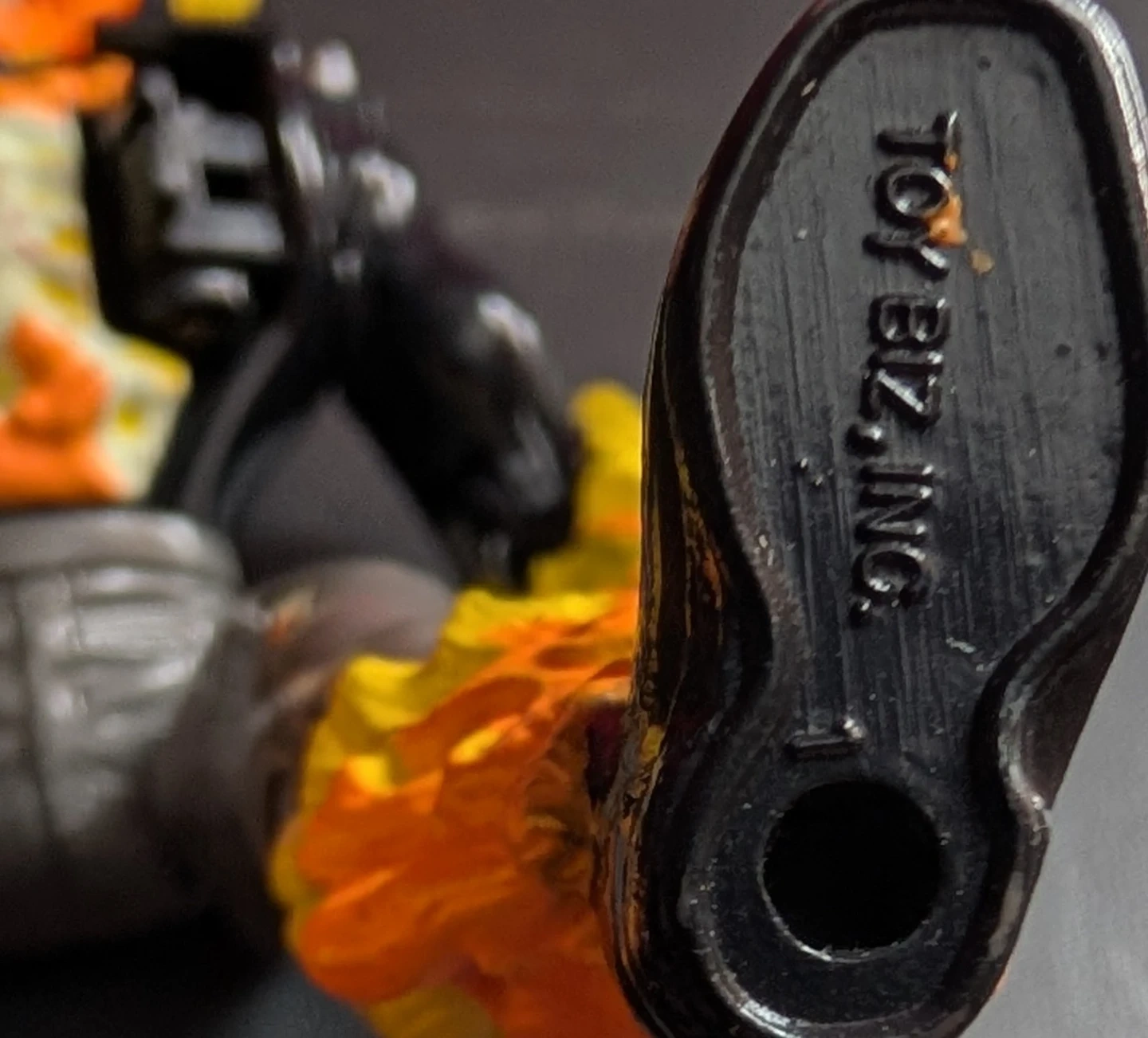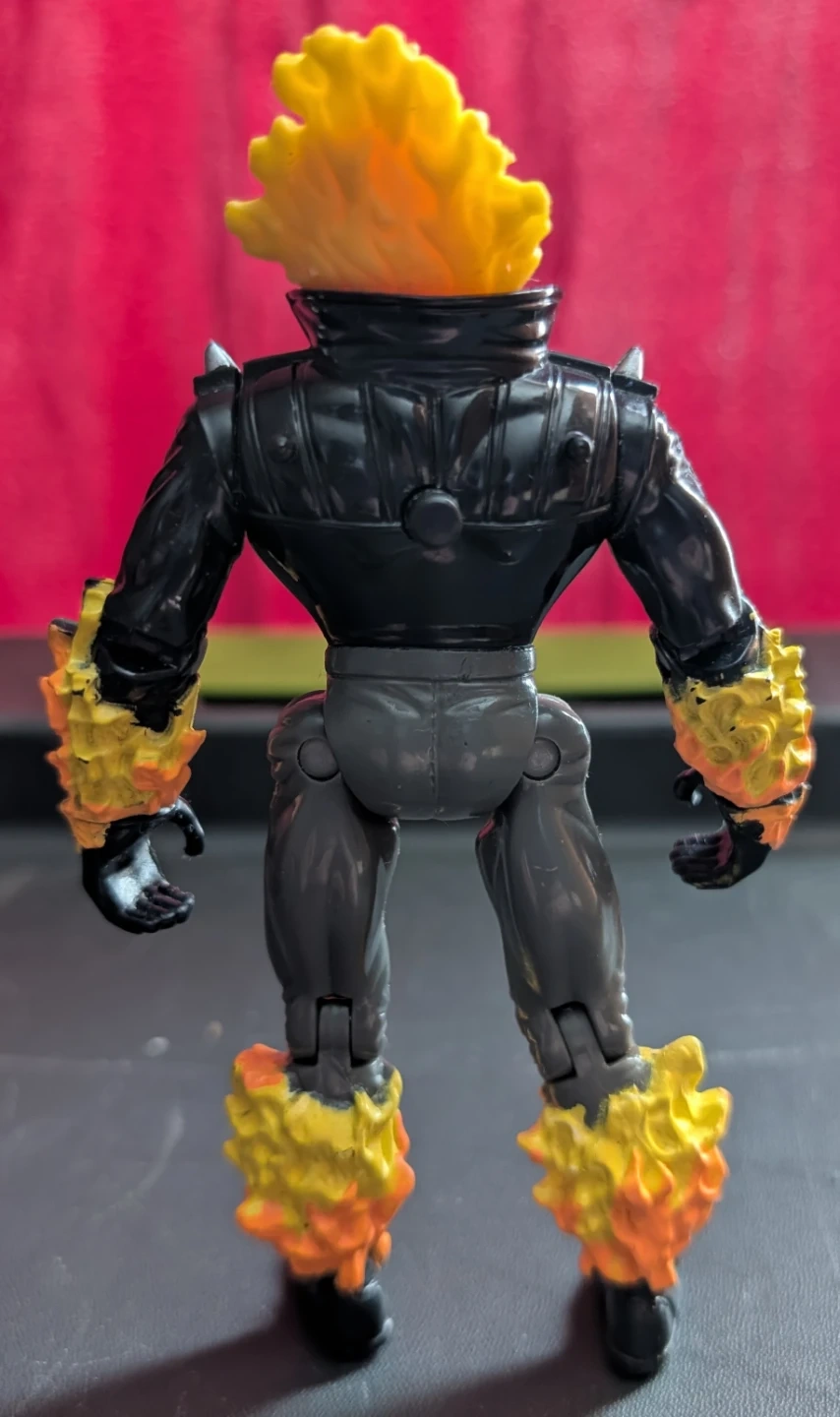 This is a 1996 Ghost Rider action figure. It's made in China and features flame detailing on its arms and legs. The skull head has a flaming effect. The skull also glows in the dark. It's a cool collectible for fans!