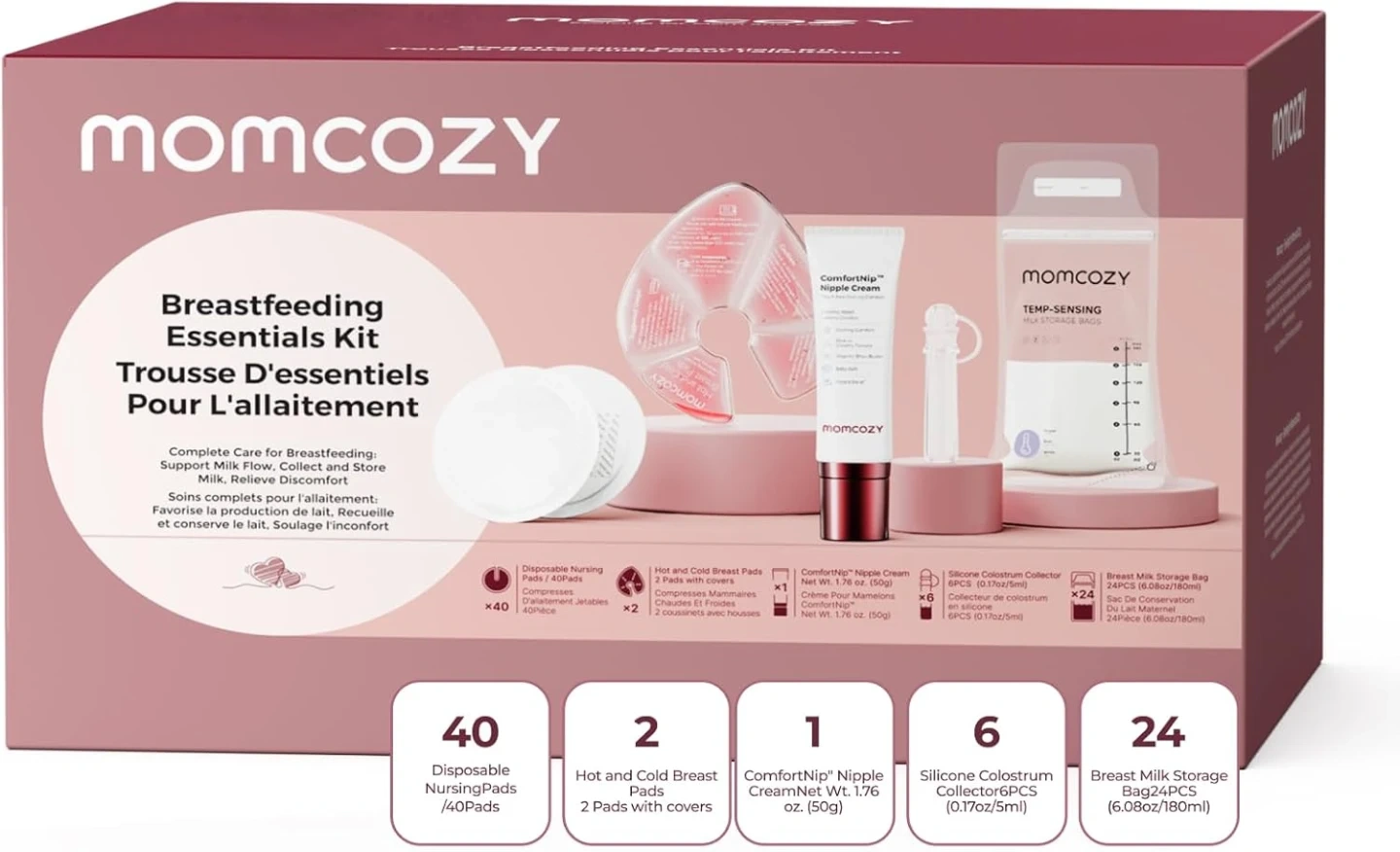 Momcozy 73-Piece Breastfeeding Essentials Kit for New Moms, Postpartum Essentials Gift Set with Nursing Pads, Hot & Cold Breast Packs, Nipple Cream, Colostrum Collectors and Breastmilk Storage Bags, Brand New in the Box/Sealed