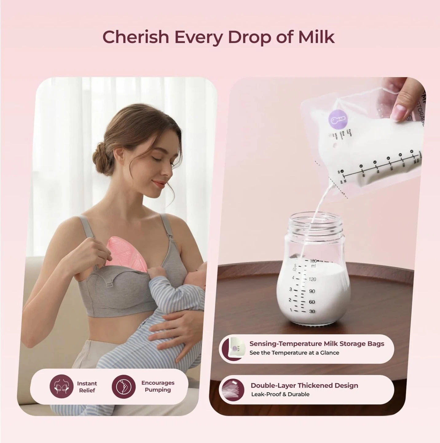 Smart Breastmilk Storage: The 5ml colostrum collectors can collect, store, and feed precious early breastmilk safely and efficiently; Temperature-sensing milk storage bags visually indicate milk temperature, helping you avoid guessing.