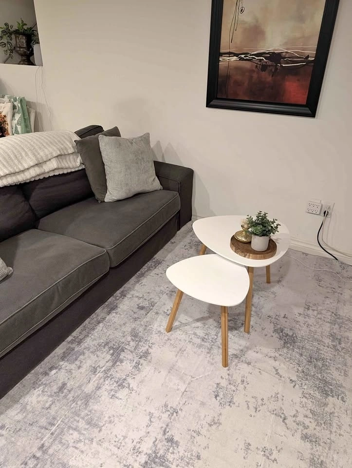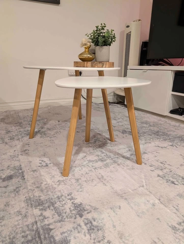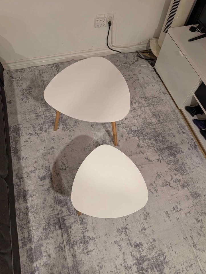 Set of 2 nesting coffee tables. Light and easy to move around and reconfigure as needed. Easy to eat at the couch. Curved triangles.