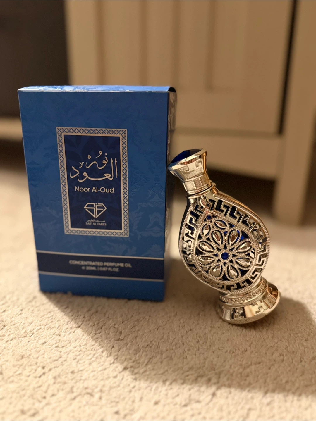 This is a 20ml bottle of Saif Al Fares Noor Al-Oud concentrated perfume oil. It comes in an ornate silver and blue glass bottle with a decorative metal casing. The perfume oil is presented in its original blue box.