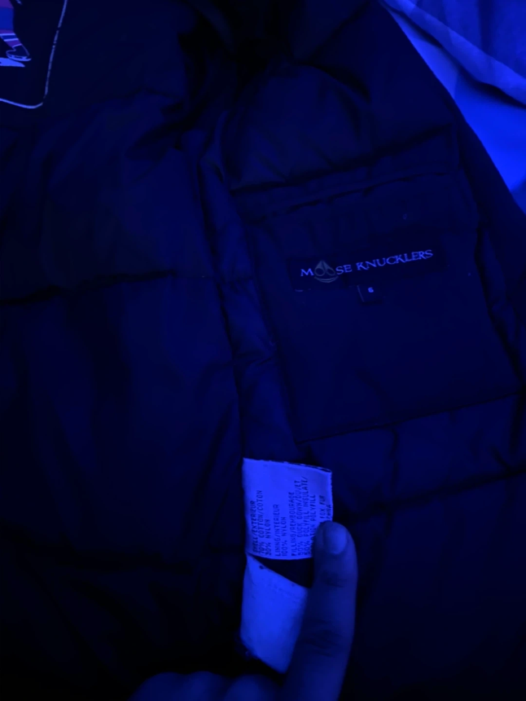 This is a Moose Knuckles black jacket featuring a fur-lined hood. It's a stylish and warm outerwear piece for colder weather. Zipper closure with snaps for extra security.