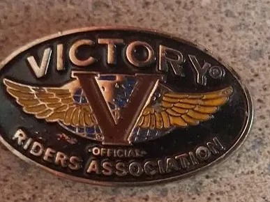 This is an official Victory Riders Association metal emblem or pin. It features the Victory logo with wings and "Riders Association" text. It's a great collectible for motorcycle enthusiasts!