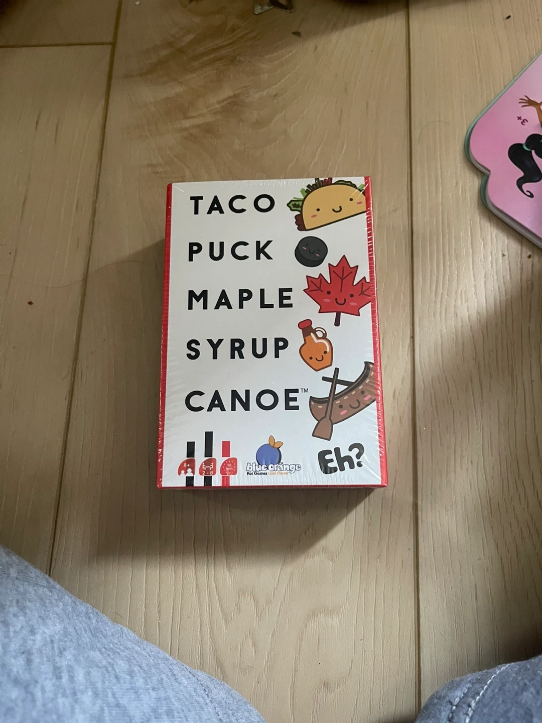 This is the Taco, Puck, Maple, Syrup, Canoe card game. It's for ages 8+ and supports 2-8 players. Game time is about 10 minutes.