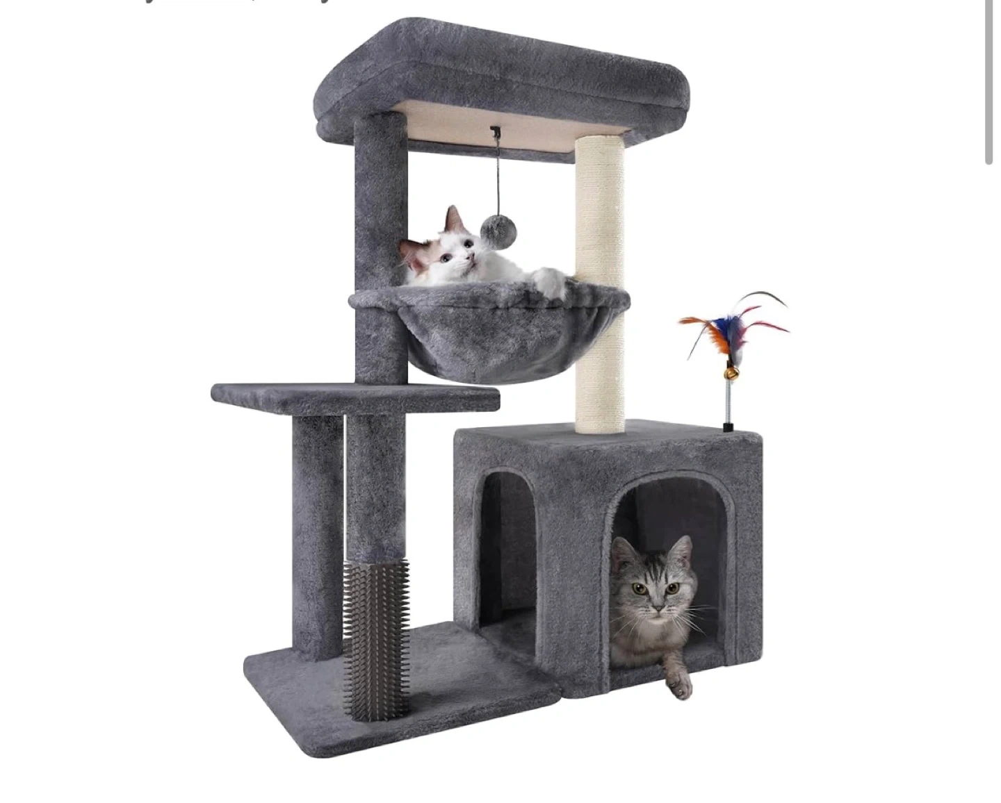 This multi-level cat tree condo is covered in soft, grey plush material. It features a hammock, a perch, a scratching post, a dangling toy, and a hideaway cubby. This provides plenty of space for your feline friends to play, scratch, and nap!
