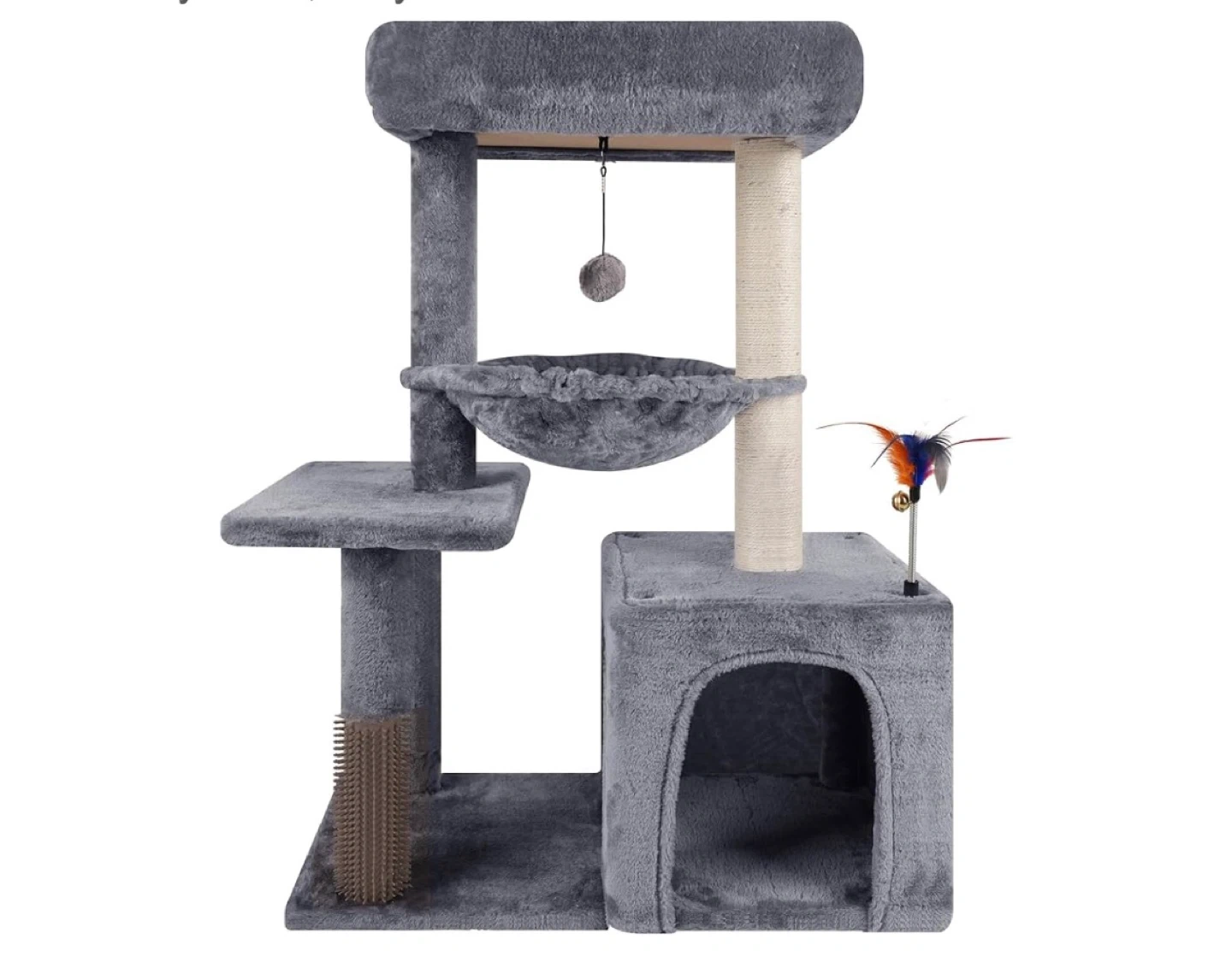 This multi-level cat tree condo is covered in soft, grey plush material. It features a hammock, a perch, a scratching post, a dangling toy, and a hideaway cubby. This provides plenty of space for your feline friends to play, scratch, and nap!