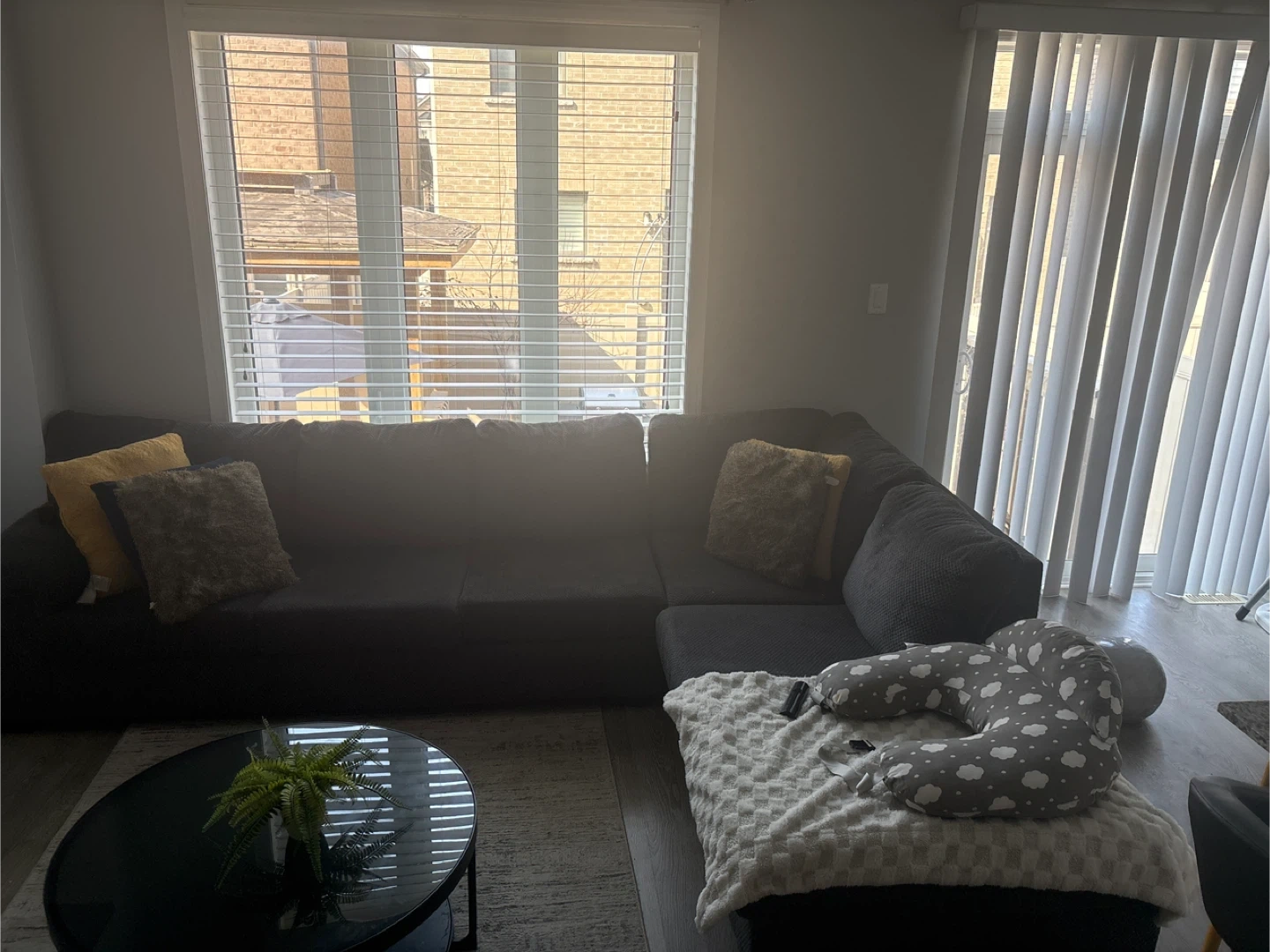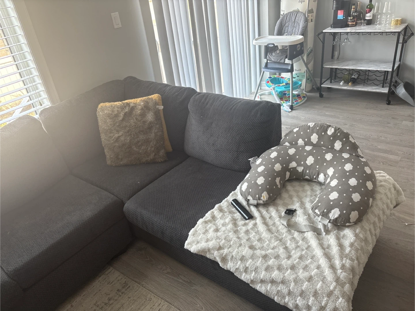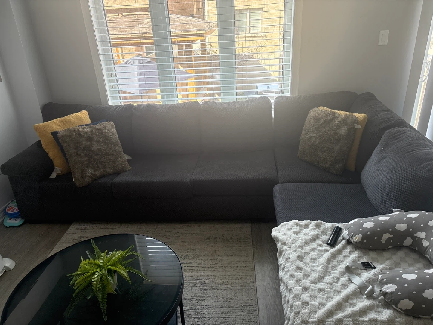 Spacious dark grey sectional sofa with a textured fabric. It offers plenty of seating space for family and friends. This sofa is perfect for lounging or entertaining guests.