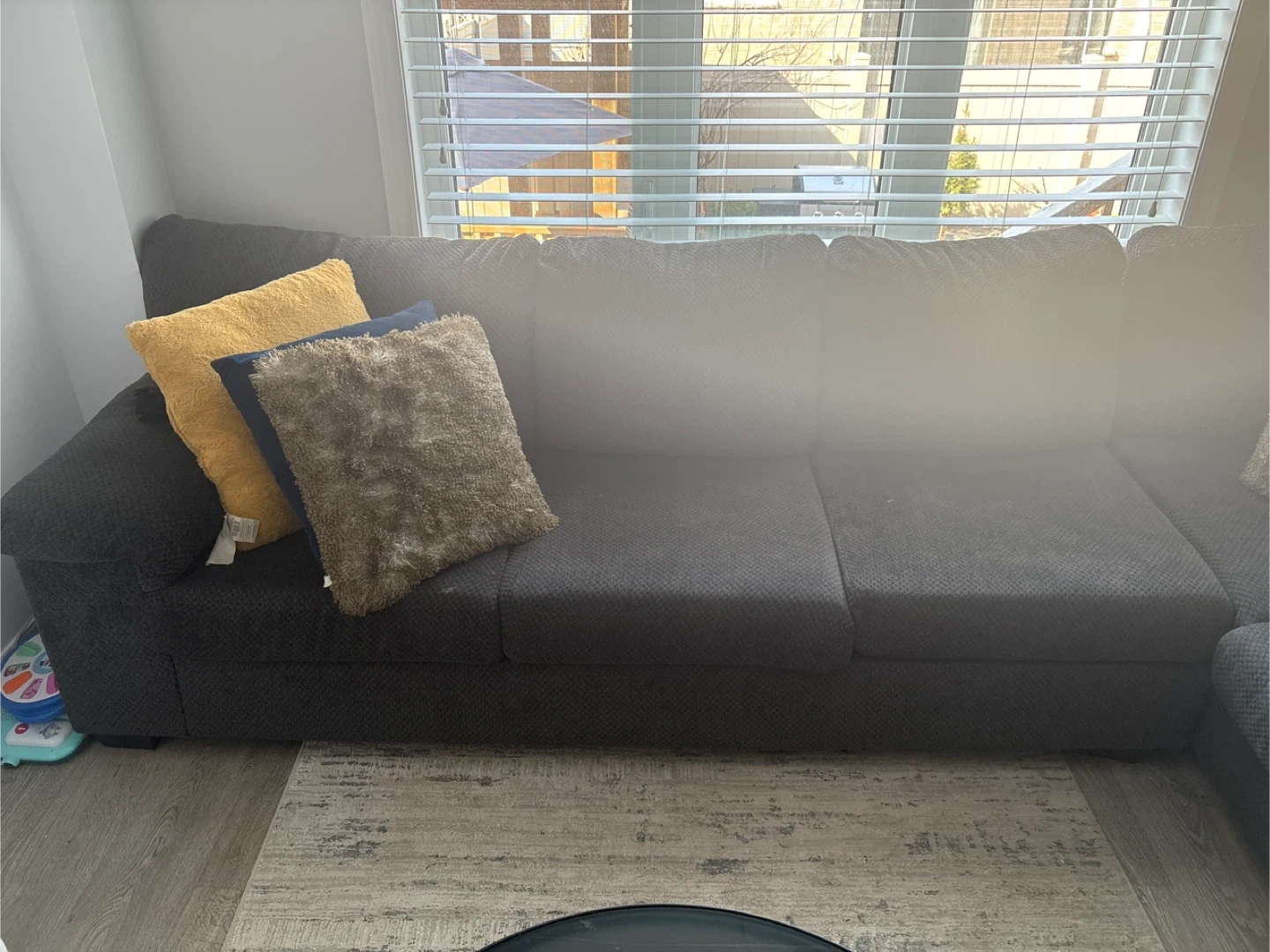 Spacious dark grey sectional sofa with a textured fabric. It offers plenty of seating space for family and friends. This sofa is perfect for lounging or entertaining guests.