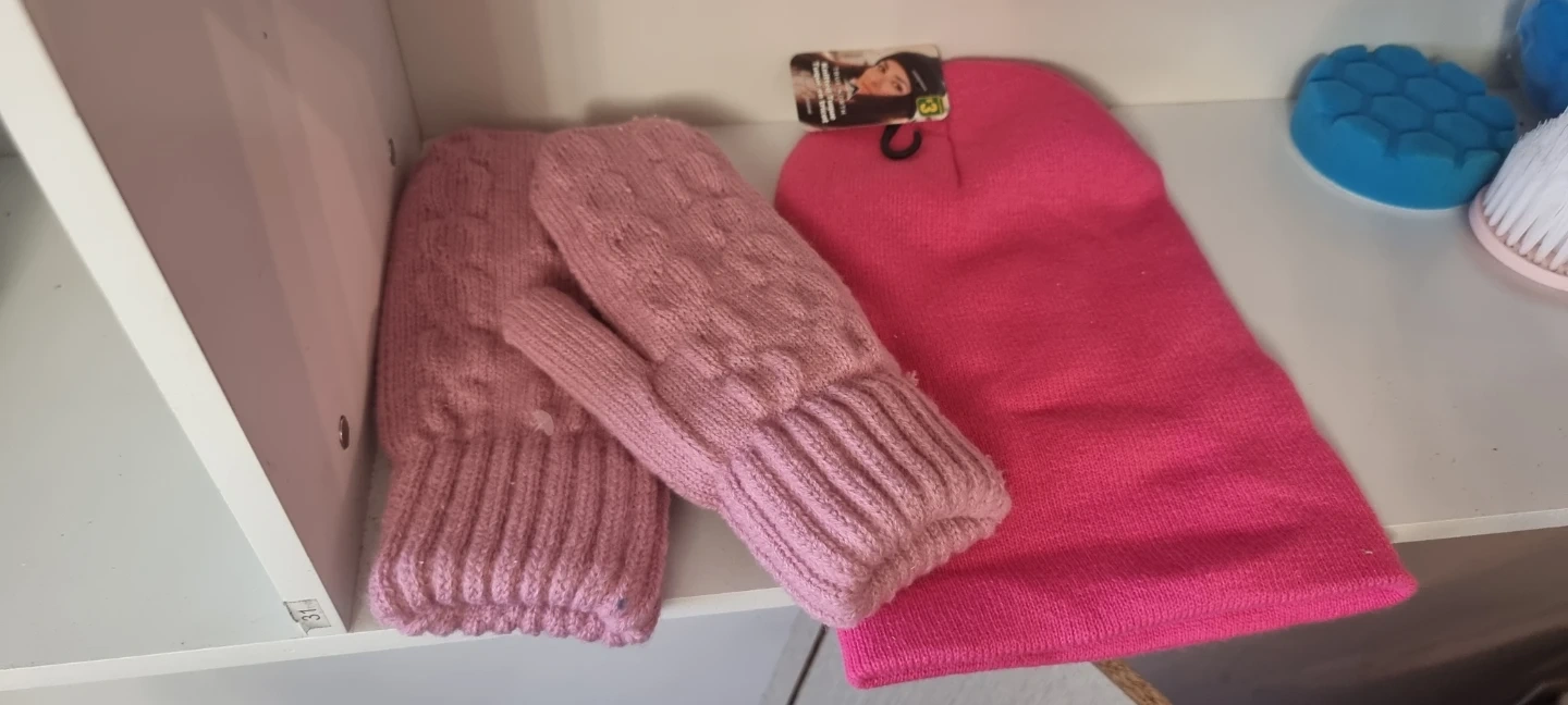Cozy pink knit mittens with a cable knit pattern. Matching pink beanie also included. Great for keeping warm on chilly days!