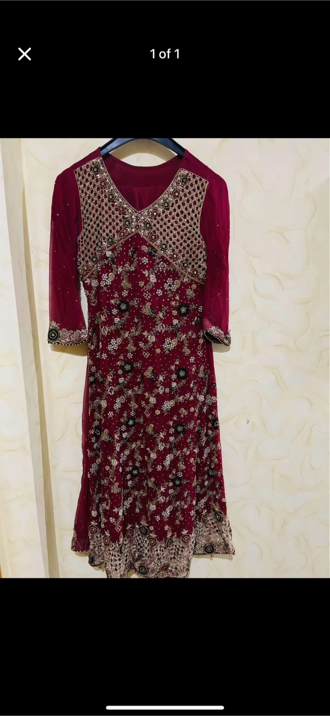 This is a beautiful maroon kurti dress with intricate gold and silver embellishments. It features a v-neckline and full sleeves. The detailed embroidery extends throughout the garment and on the cuffs. It's perfect for festive occasions or special events!