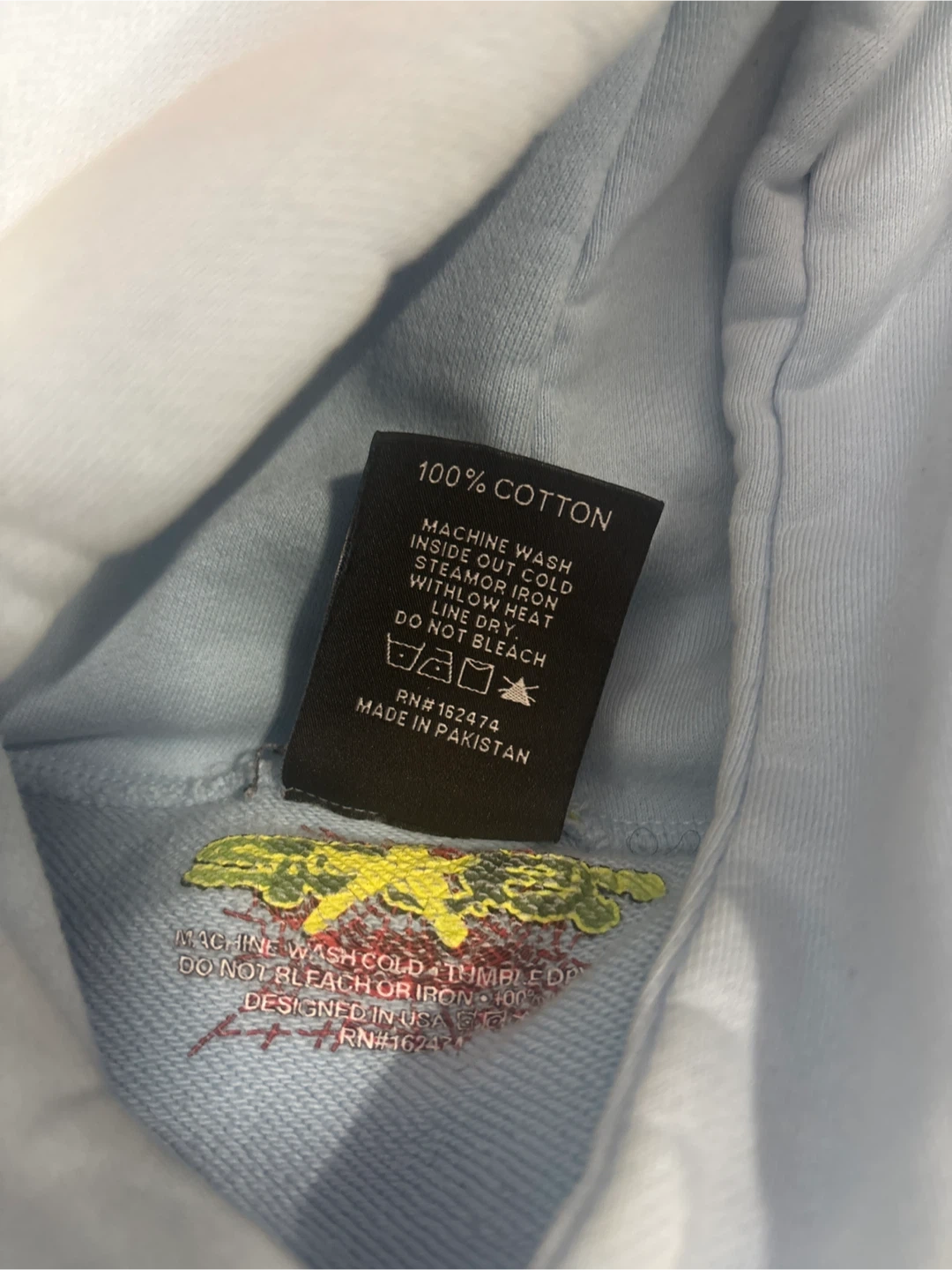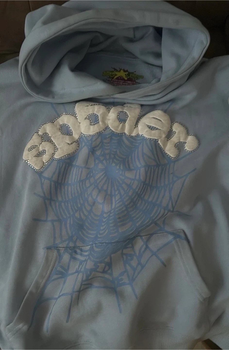 This light blue SP5DER hoodie is made from 100% cotton. It's designed in the USA and made in Pakistan. This pullover features a front graphic with the SP5DER logo and a web design.