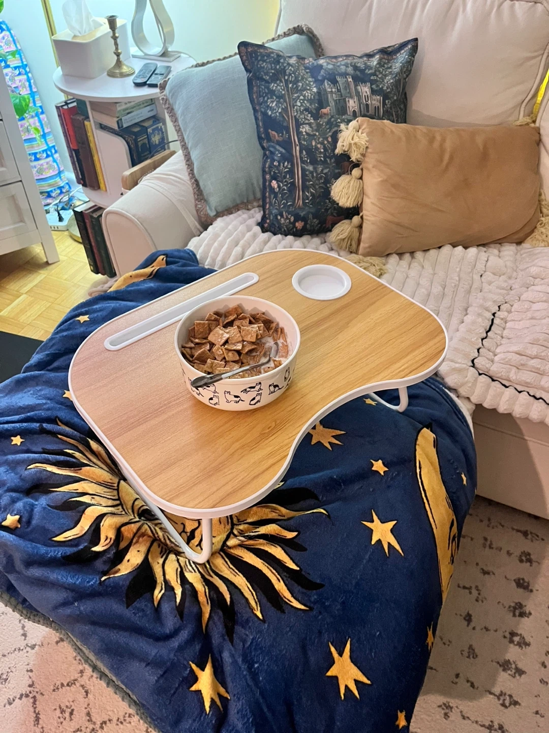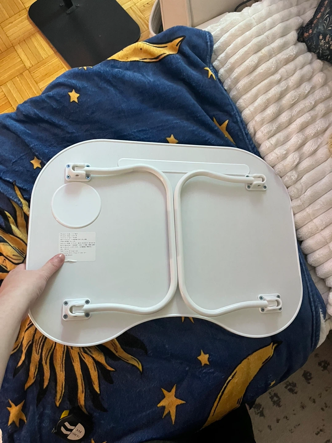 Selling a foldable bed tray table, great for breakfast or working from bed, or just needing a little extra surface space. It features a convenient shallow cup holder, and slot for pens or phone. Folds flat for easy storage when not in use. In like new condition.
