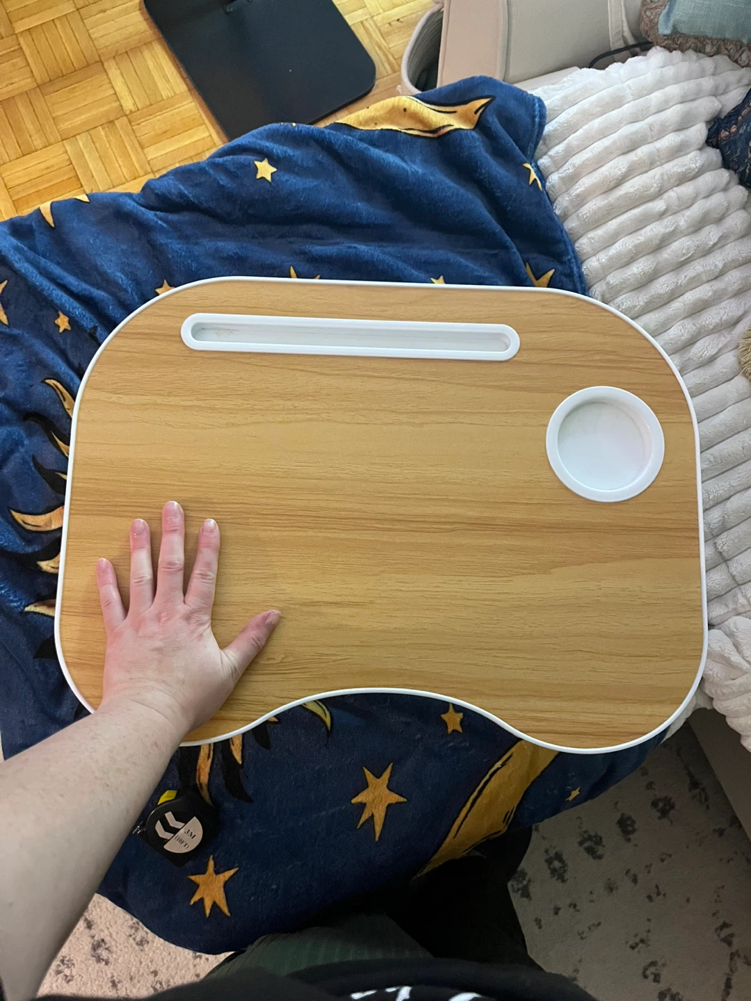 Selling a foldable bed tray table, great for breakfast or working from bed, or just needing a little extra surface space. It features a convenient shallow cup holder, and slot for pens or phone. Folds flat for easy storage when not in use. In like new condition.
