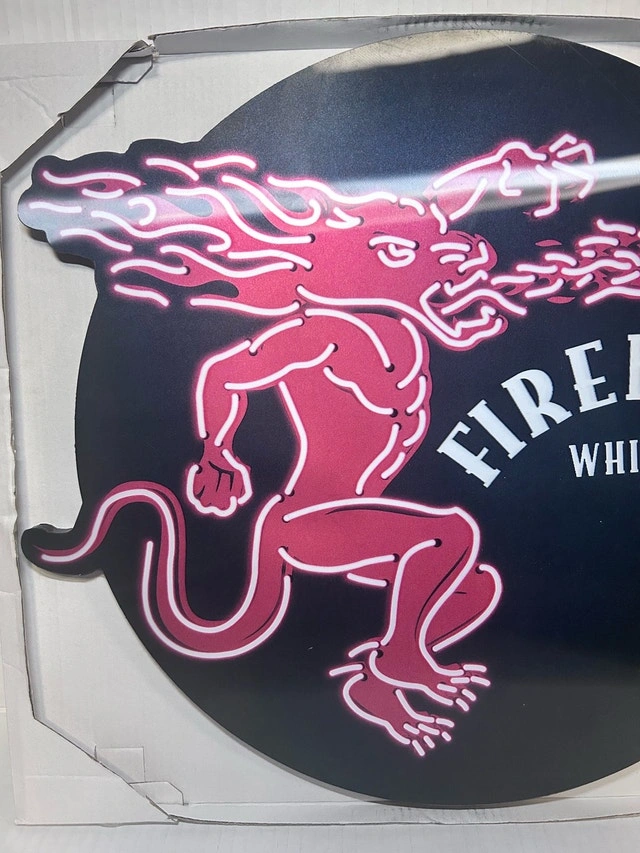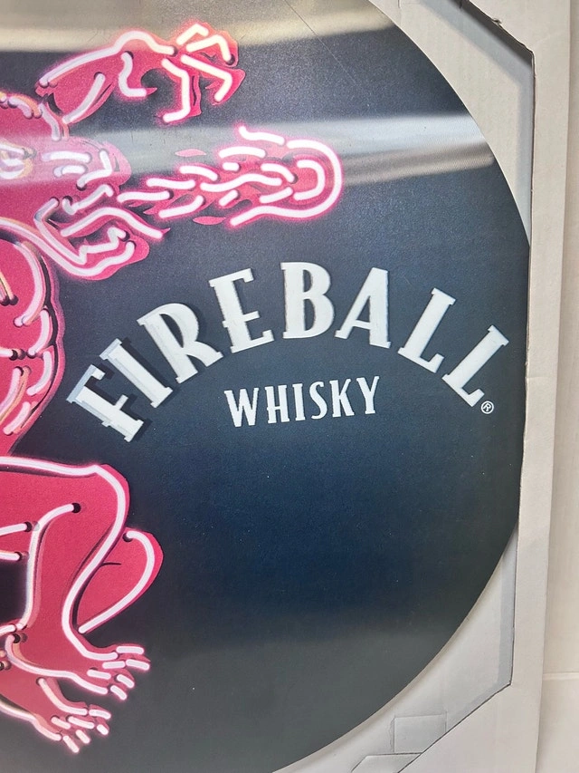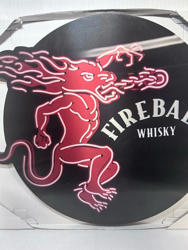 Spice up your home bar or collection with this vibrant Fireball Whisky sign! This sign is new, never used, and features the iconic Fireball dragon in a fiery red. Perfect for adding a touch of fun to any space. This whimsical piece is looking for a new home, and if the ad's still up, it's still available! Cash accepted.