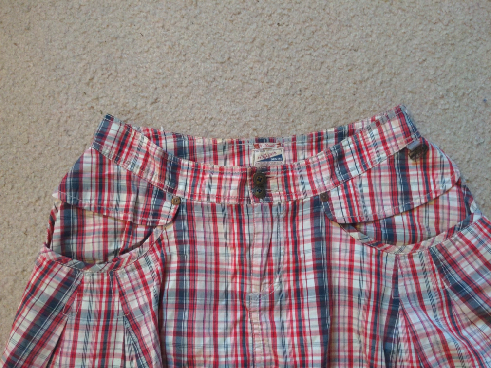 Women's X-Small (fits also small) red, white, and navy plaid skirt. Button closure. Pleated. Two pockets. 100 cotton