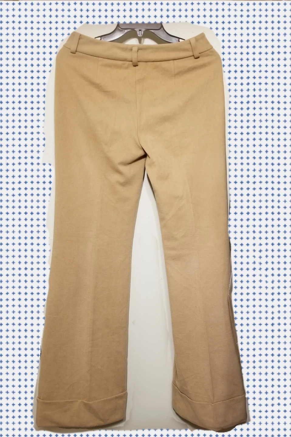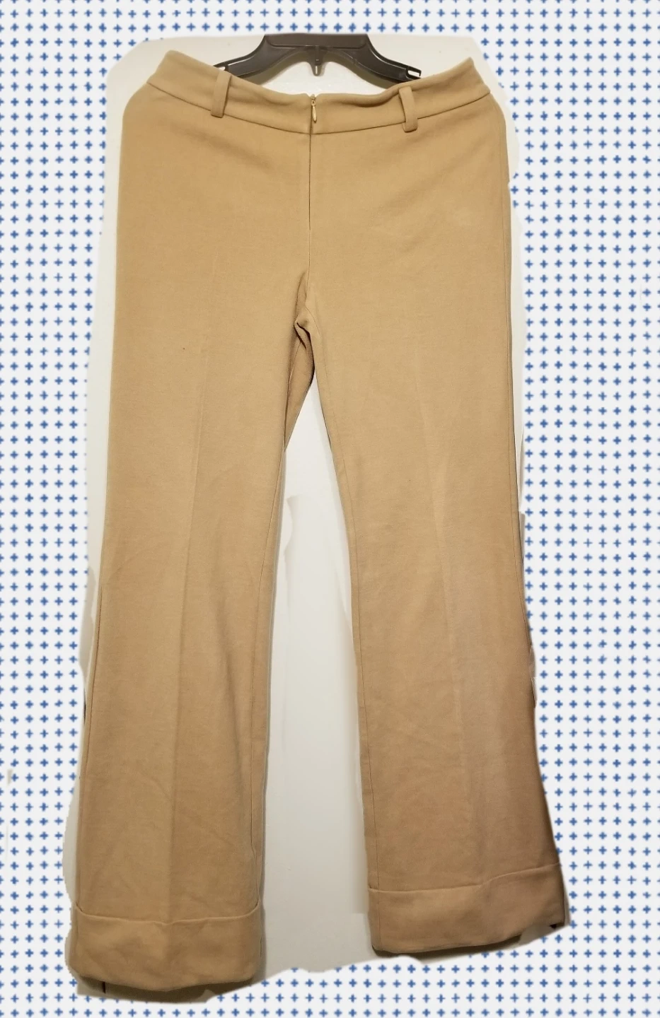 Express women's beige pants. Made in Korea. Fabric blend of 58% acrylic, 40% polyester, and 2% spandex. Machine wash cold with like colors.