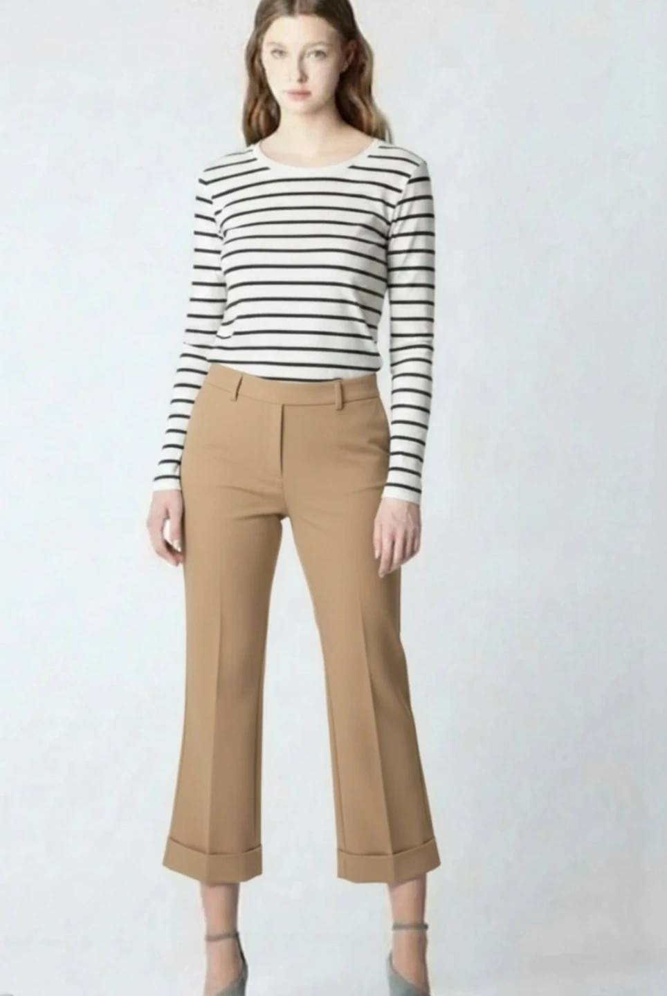 Express women's beige pants. Made in Korea. Fabric blend of 58% acrylic, 40% polyester, and 2% spandex. Machine wash cold with like colors.